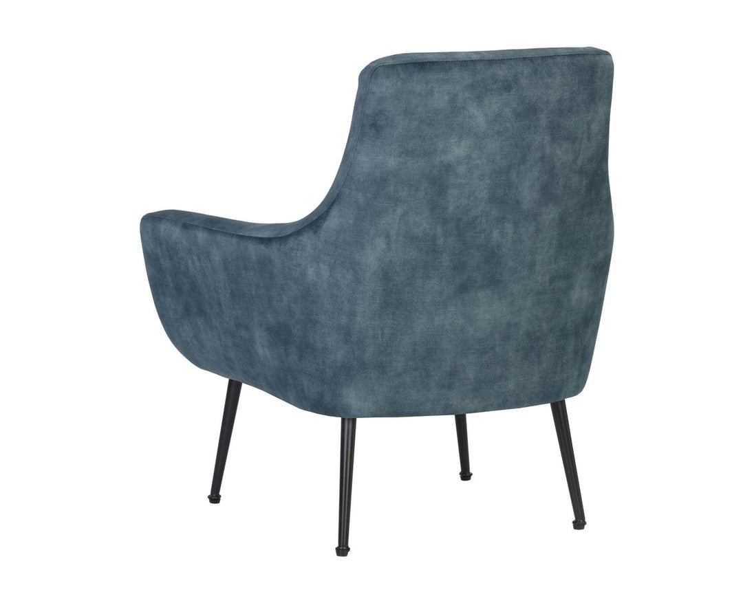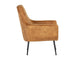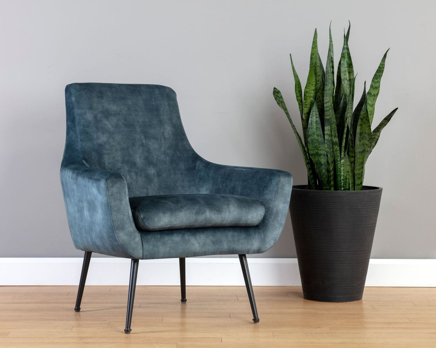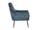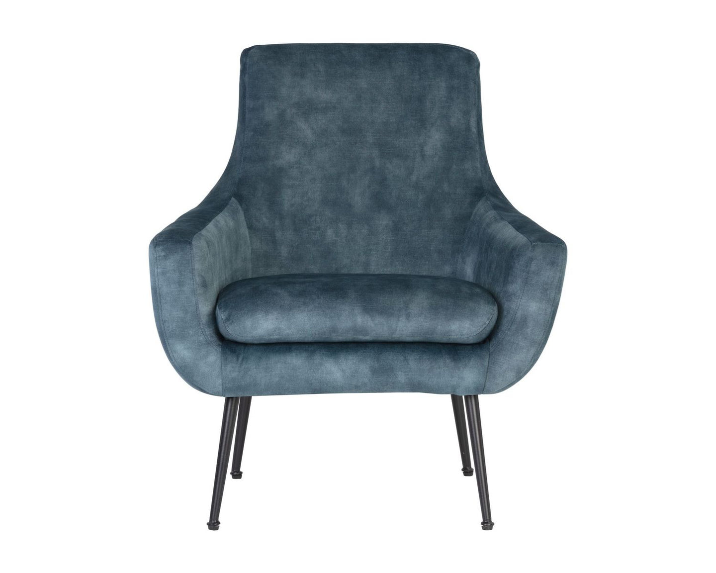 This glamorously designed armchair will draw attention through any lounge space. Features a modern seat in nono tapenade gold or petrol fabric. Black iron legs complete the look.