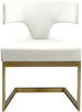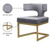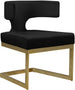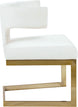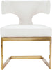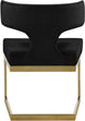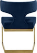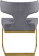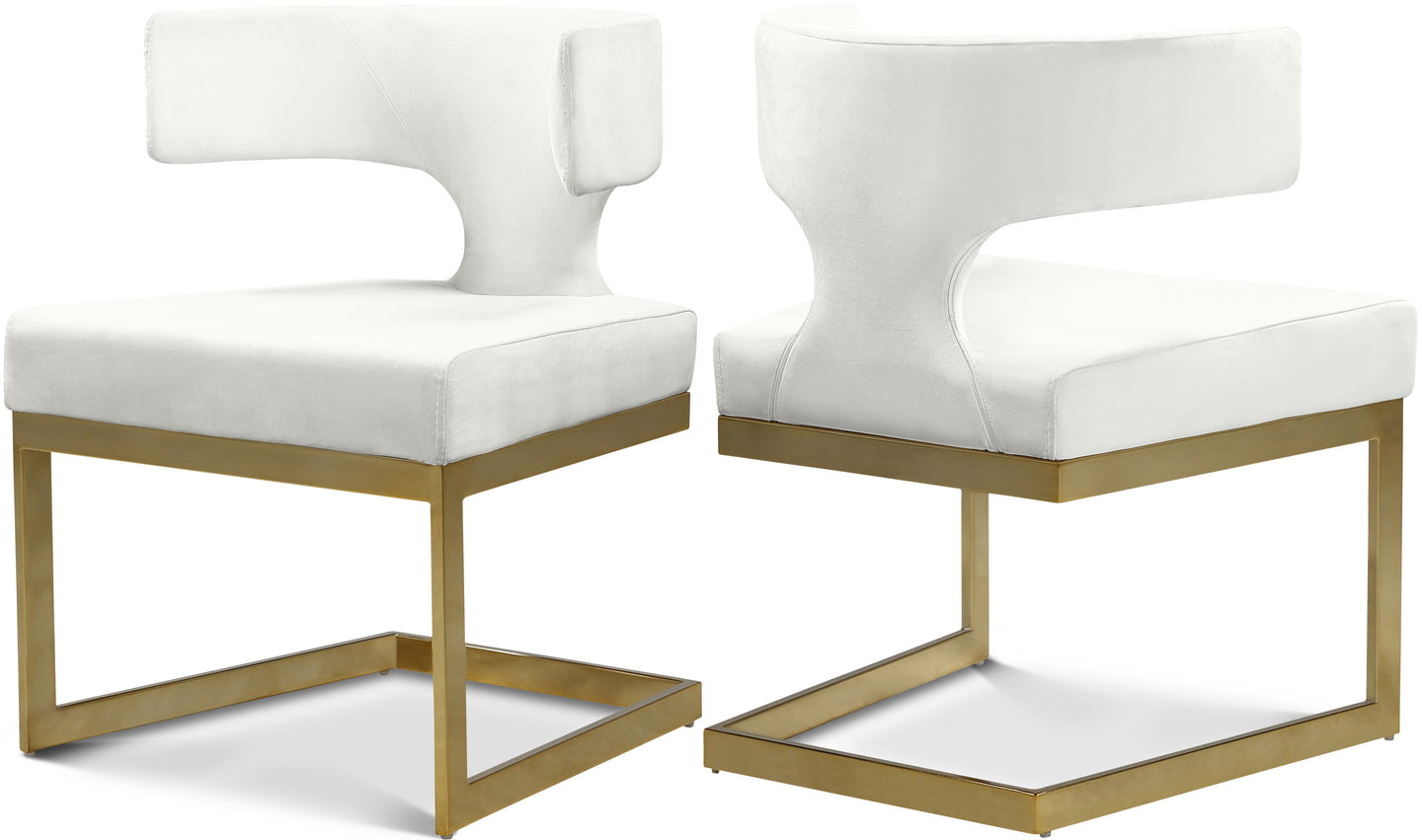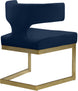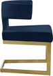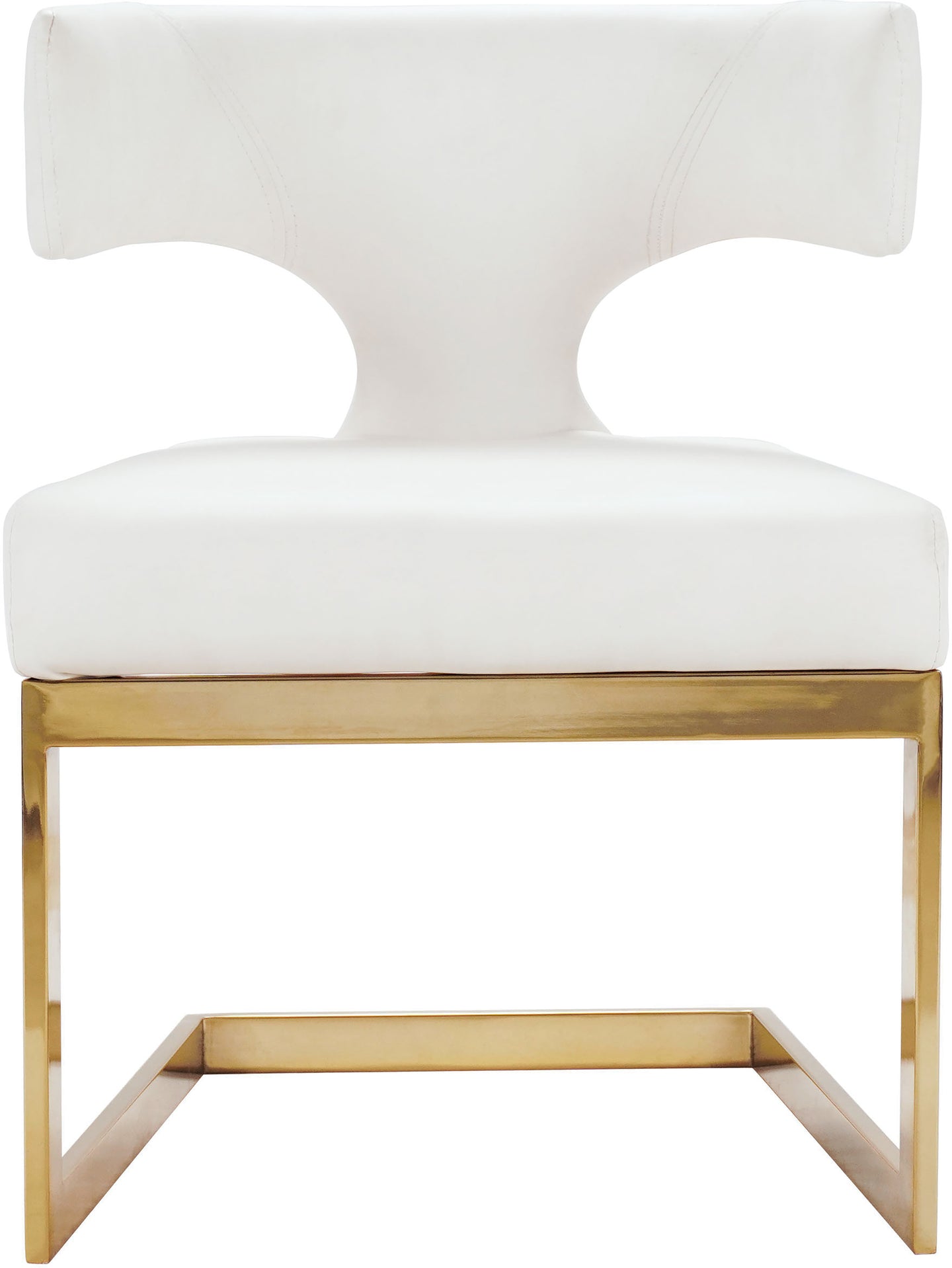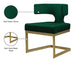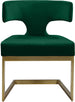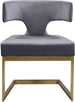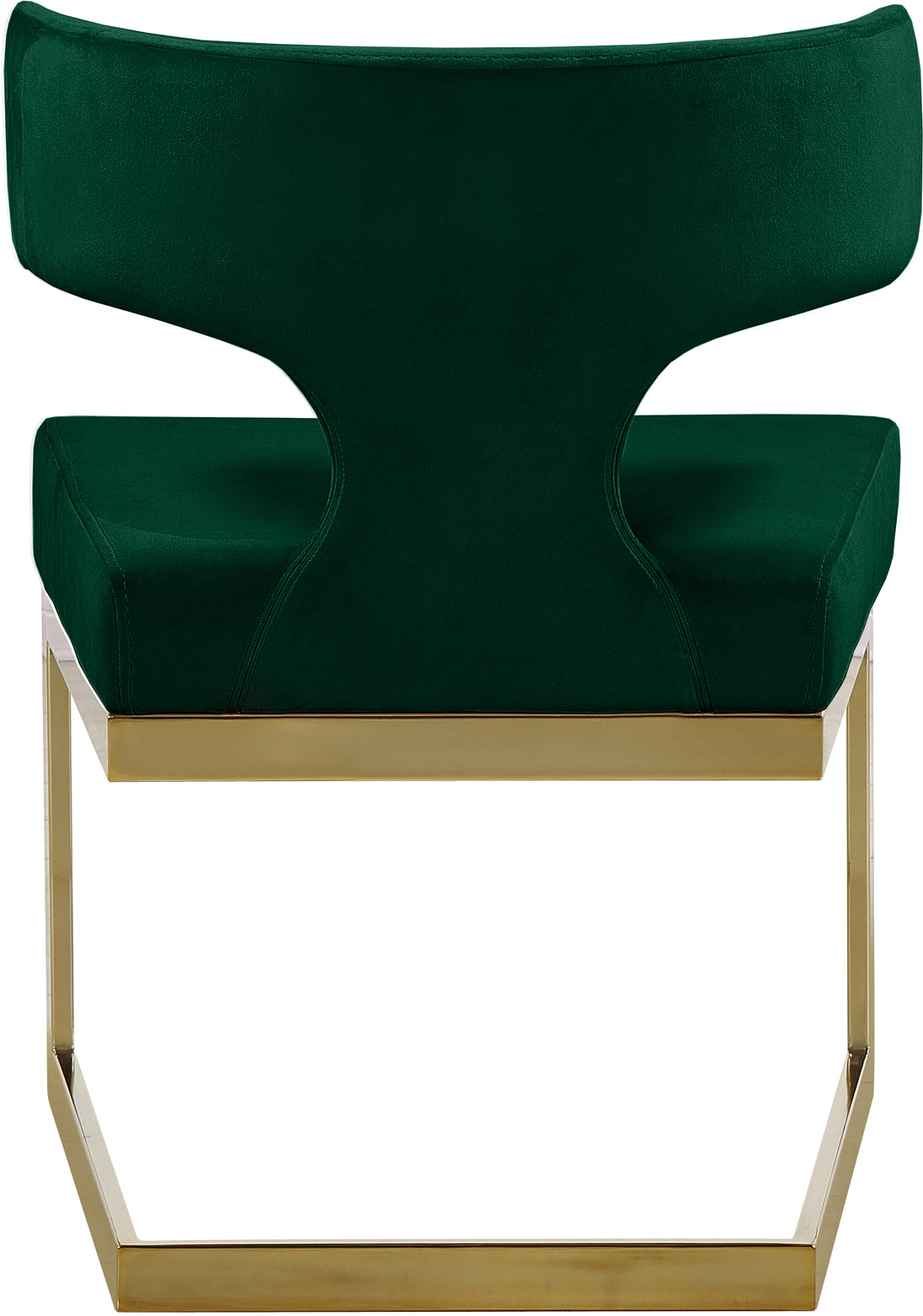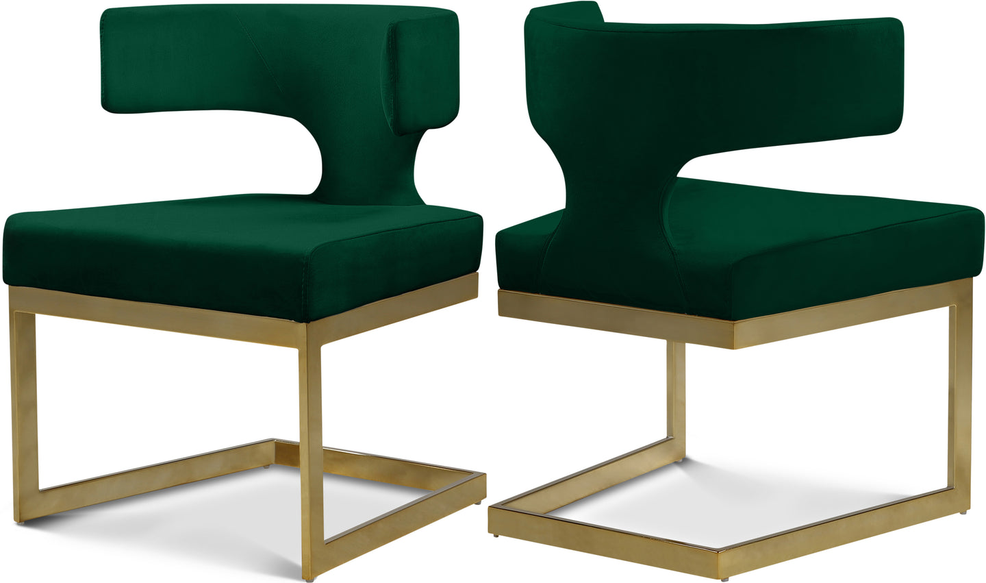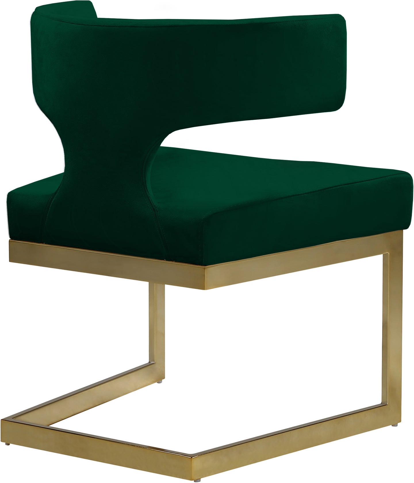Bring artful living to your dining room with this Alexandra velvet dining chair. This sumptuously appointed chair has a back design that cradles your body as you sit, making dinner time an experiment in total relaxation. Soft velvet upholstery covers the back and the plumply padded seat, ensuring you get extra cozy while you eat. A rich gold metal base adds to the chair's beautiful durability.