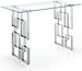 Enjoy a contemporary look in your living room or den with this stylishly elegant Alexis chrome console table. This Meridian Furniture table is made from glass and metal for a sleek, modish look. The base features a geometric design with intertwined squares that form two pedestals. The top is crafted from thick, clear glass that allows the beauty of the base to shine through completely. A chromed finish shores up the design, adding to its up-to-the-minute feel.