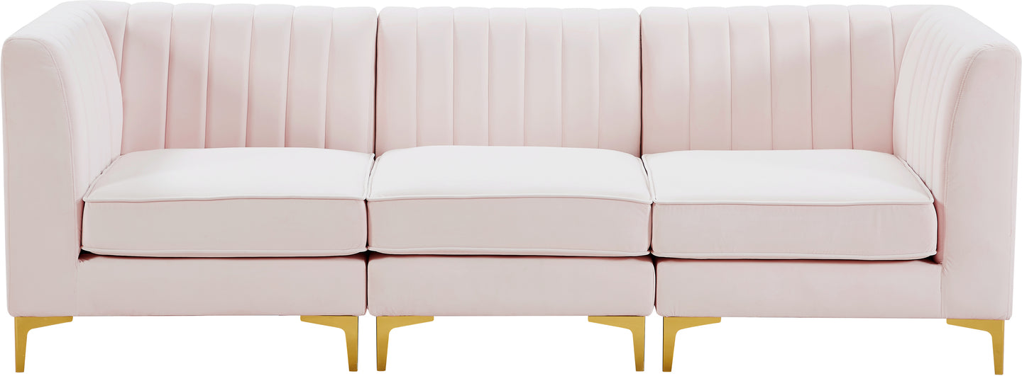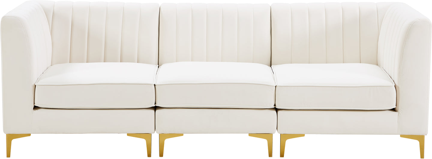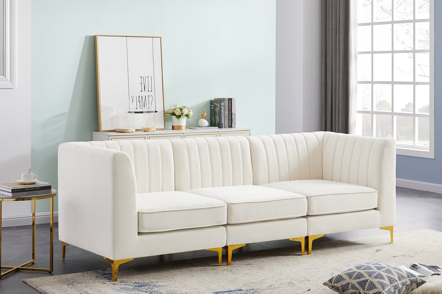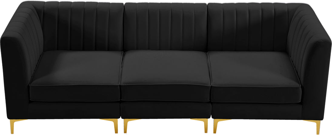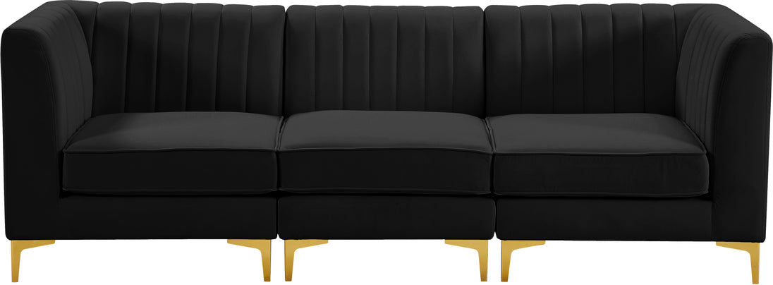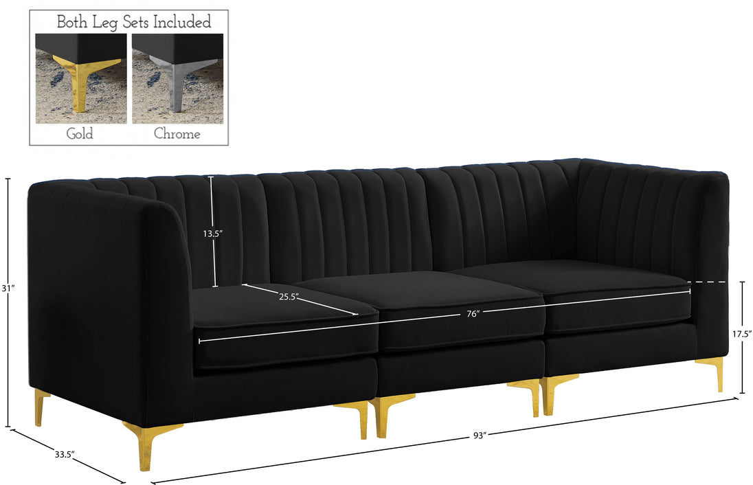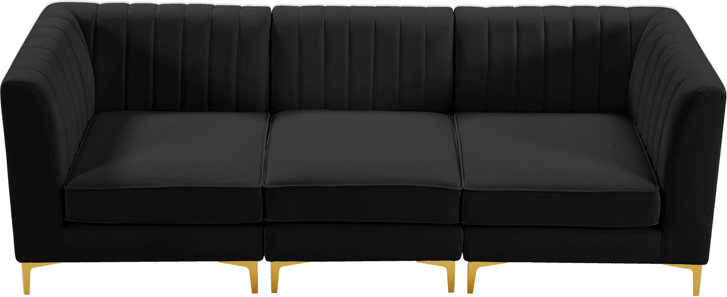 Bring modern beauty to your space with the addition of this Alina Velvet Modular Sofa. This beautiful sofa features deep channel tufting to ramp up its visual interest and add to its resilient demeanor. Its soft black velvet upholstery blends nicely with existing elements in your room and is sleek to the touch, making this seat a super comfortable one. Part of the modular Alina collection, this sofa has a latch that attaches it to other pieces to create your custom seating arrangement.