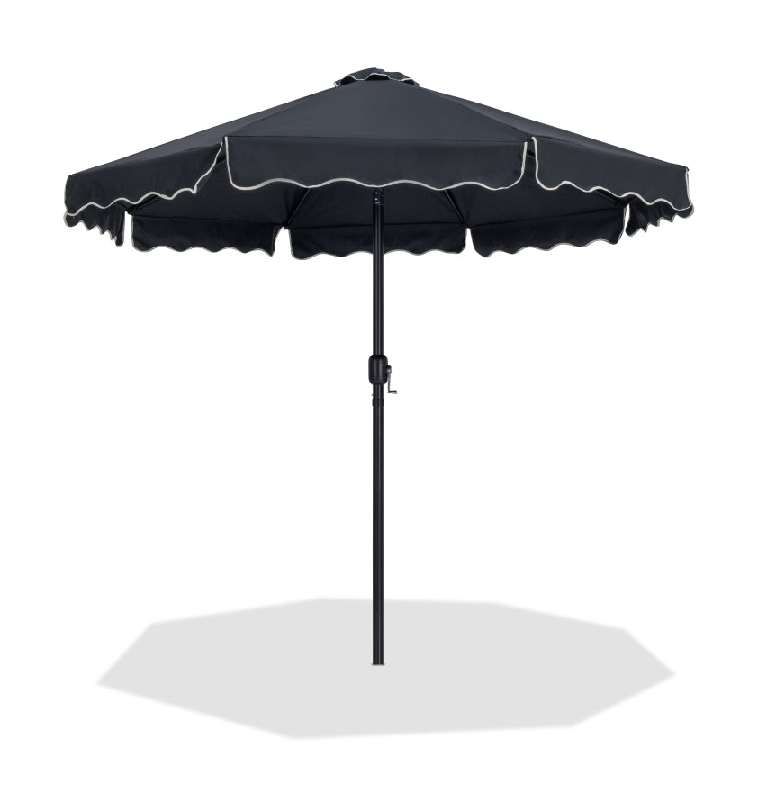Escape from the sun's rays when you're basking beneath this Amalfi black fabric with cream piping and matte black aluminum patio umbrella. This umbrella is an ideal option for adding shade to any area of your deck or patio. The aluminum pole weathers the elements with ease and is finished in matte black for a resort-inspired look. The umbrella's fabric is water and color-fade-resistant, ensuring lasting beauty in your outdoor space.
