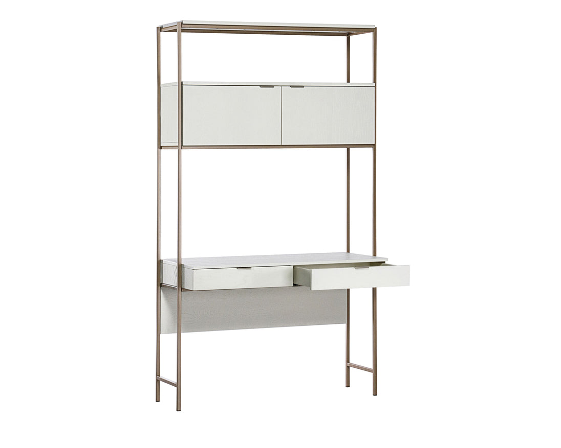 Crafted in Indonesia, this beautiful wall desk will bring modern style and elegance to living, lounge and home office spaces. Designed with cream finished oak wood and a champagne gold iron frame. Features two cabinets and two drawers for added style and function. Coordinate with the Ambrose modular wall desk, and large and small bookcases for a space saving design. Media console and cabinet also available. As wood is an organic, porous material, these pieces will contain natural variation of texture and may also exhibit fine indentations and cracks. Wood pieces will also display a disparity of colour and grain, and visible knots and burls that add to the character of each piece.
