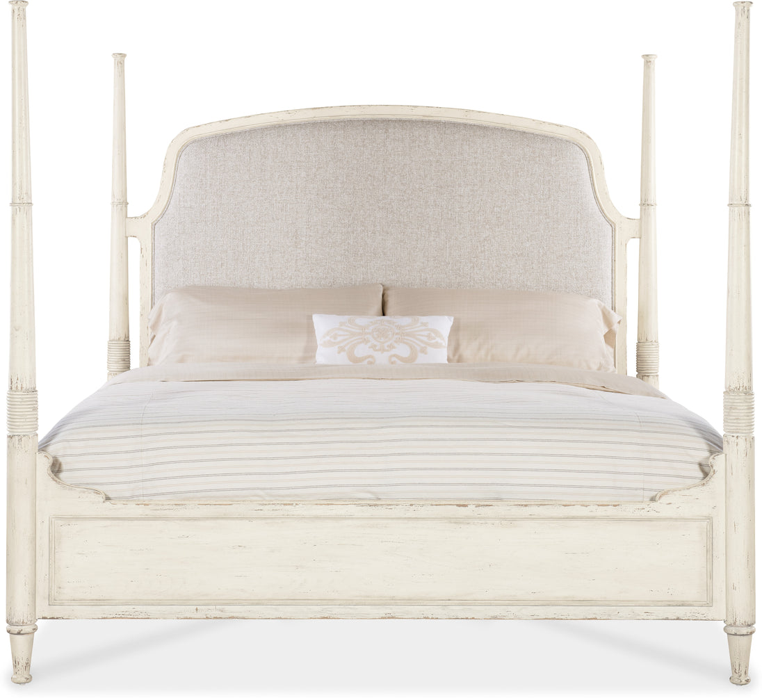 In a stunning reimagination of the classic Southern 4-poster bed, the inviting Americana California King Upholstered Bed has an upholstered fabric headboard with welt trim, in a creamy white color complementing the timeworn white Daisy finish over Cathedral Oak Veneers. There are carved accents on the posts and scroll work on the upper sides of the footboard. The footboard comes with capes for a low-post option.