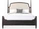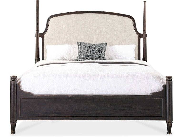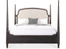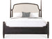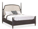In a stunning reimagination of the classic Southern 4-poster bed, the inviting Americana Queen Upholstered Bed has an upholstered fabric headboard with welt trim, in a creamy white color contrasting with the deep, dark Molasses finish over Cathedral Oak Veneers. There are carved accents on the posts and scroll work on the upper sides of the footboard. The footboard comes with caps for a low-post option.