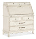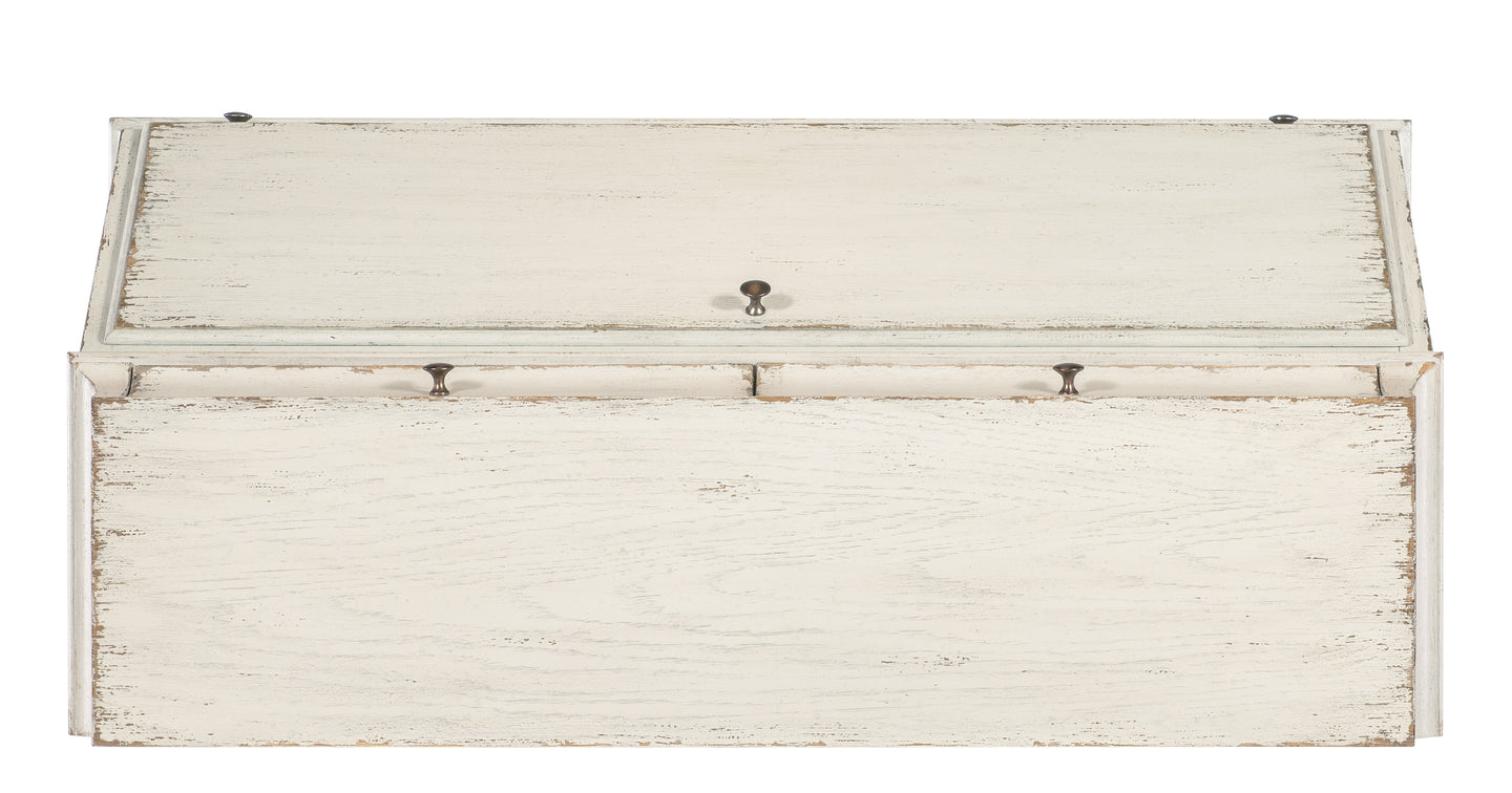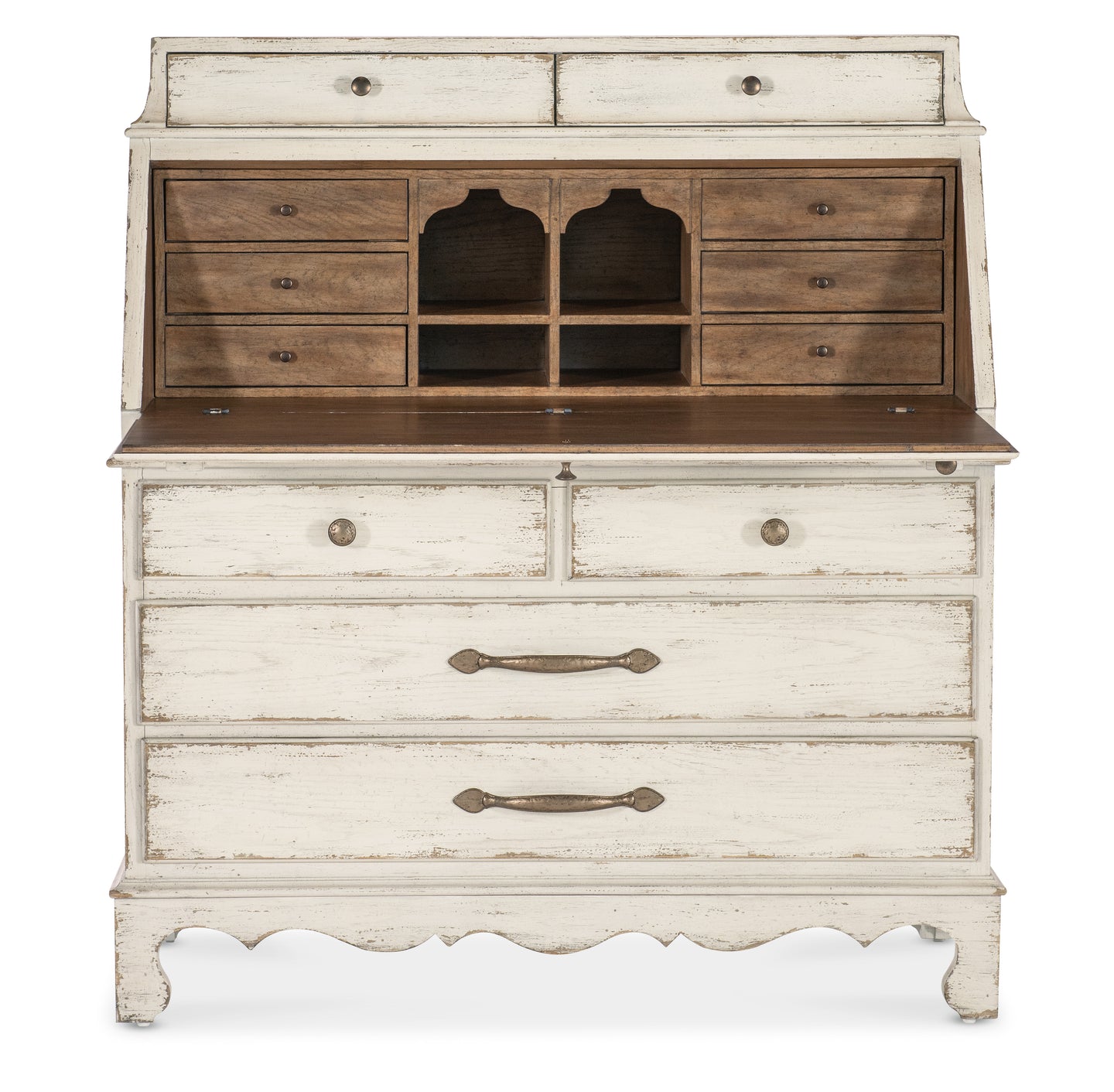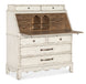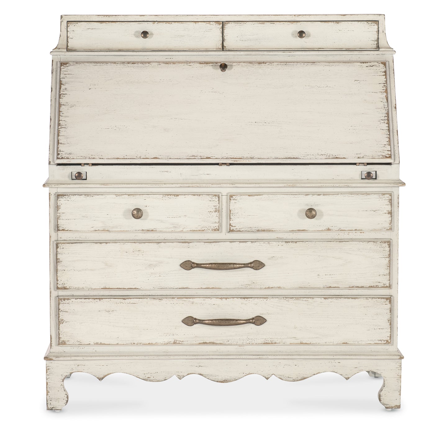 Celebrating the natural beauty of a simpler time, the Americana Secretary has an historical form with a scalloped, shaped base and legs and a drop-front work surface. Crafted of Oak Veneers with a Solid-Wood Edge Top in the time-worn white Daisy finish, it features metal alloy bar and round pulls in antique bronze. There are two top drawers and six small storage drawers behind the drop-front, along with four storage cubbies. Four self-closing bottom drawers. The interior is finished in the warm, nostalgic Honey finish.