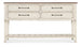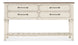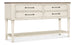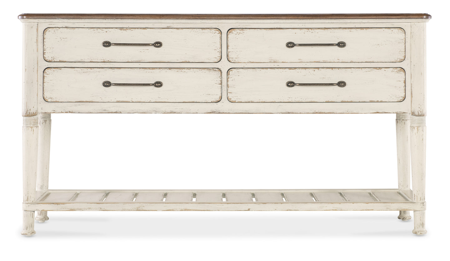 Reimagining a historical design with a fresh take on finish, function and form, the Americana Server has a nostalgic silhouette with details including one fixed plank shelf on the bottom and carved accents on the legs. Crafted in Oak Veneers with a Solid-Wood Edge Top, it is finished in the time worn white Daisy tone on the case with the gentle brown Honey finish on the top. Featuring 4 self-closing drawers, the top left drawer has black removable felt liner and the top right drawer has removable felt-lined silverware tray. The interior finish is Honey.