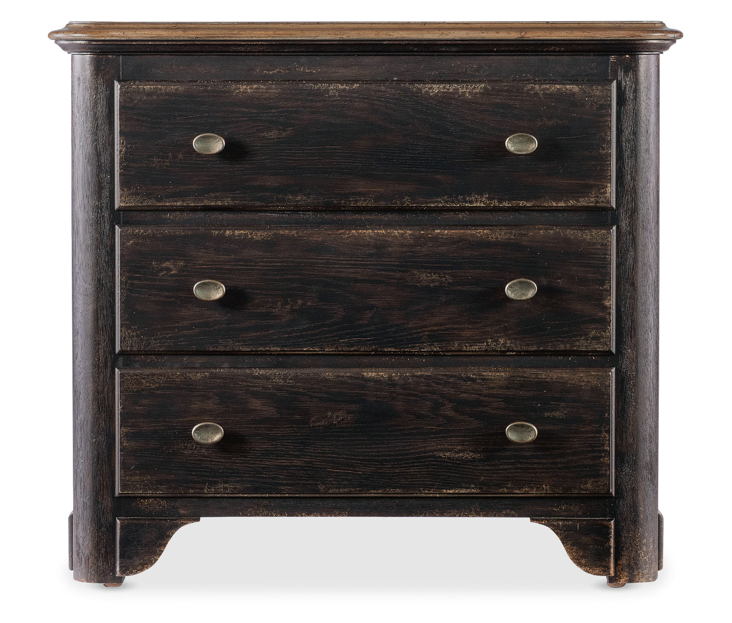 In a two-tone finish with the deep, dark Molasses on the base and the warm Honey on the top and drawer interiors, the Americana Three-Drawer Nightstand is a classic, charming design with nostalgic flair. There are 3 self-closing drawers and a solid-wood edge top. Crafted of Oak Veneers with metal alloy pulls in an antique bronze finish.