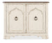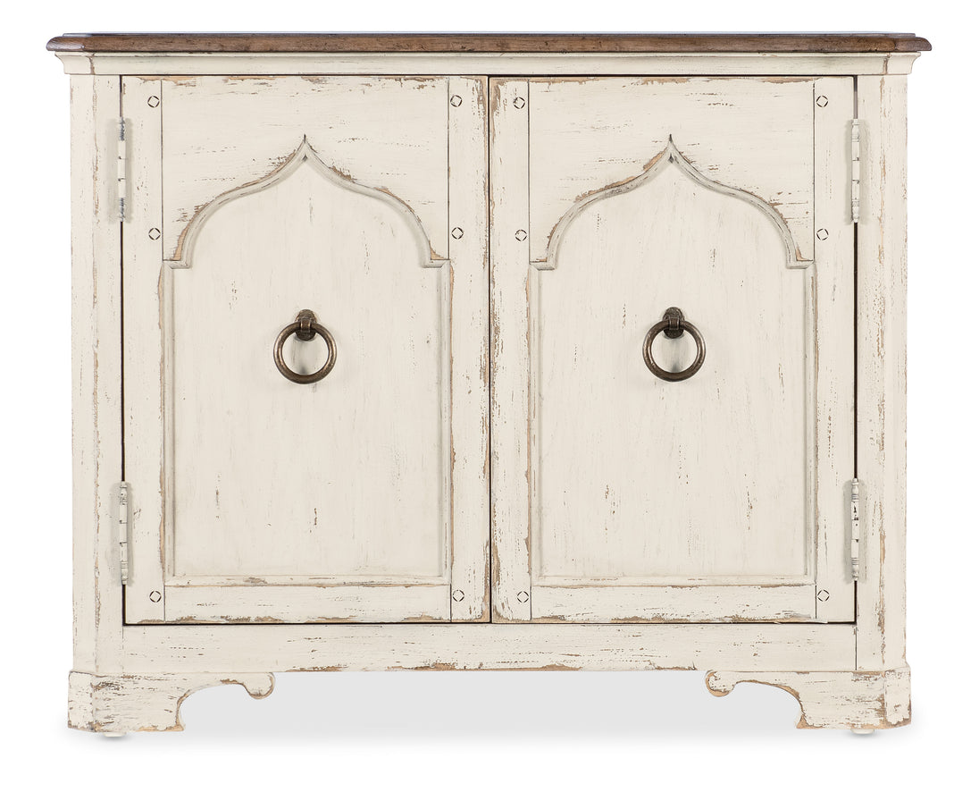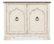 Reimagining an historical piece with a fresh take on finish, function, hardware and form, the Americana Two-Door Nightstand has shaped carved door fronts with an architectural arched design and scroll accents on the base. The two-tone finish pairs the timeworn white Daisy on the case with the warm Honey on the top and drawer interiors. The two doors have magnetic catches and one adjustable wood shelf behind the doors. Crafted of Oak Veneers, the nightstand has a solid-wood edge top.