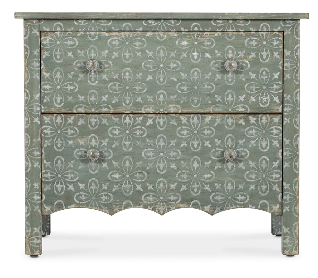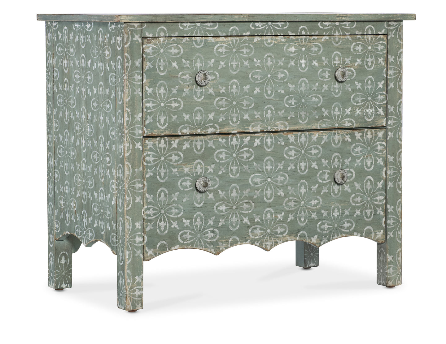 In a classic, charming design with a nostalgic flair, the Americana Two-Drawer Nightstand has a scalloped-bottom shape and is finished in a soft Antique Green with distressing and rub-through over Oak Veneers. A white floral scroll pattern covers the exterior, and the interior has a Honey finish. Metal alloy knob pulls in an antique pewter finish have white hang-up accent. Two self-closing drawers.