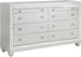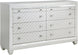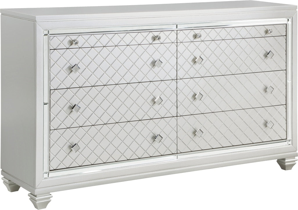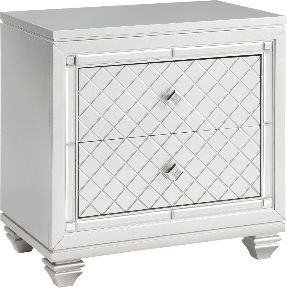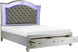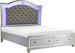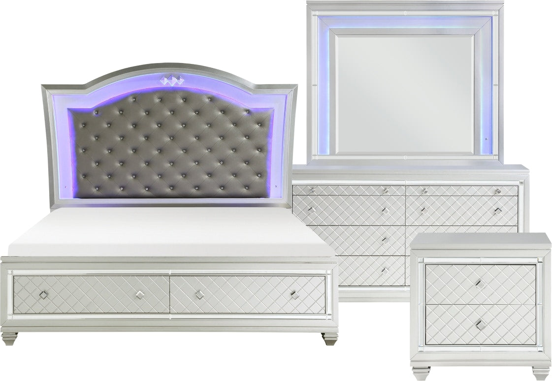 Product Description: The bold visual presentation of the Leesa Collection complements your glamorous design aspirations. The queen bed features diamond pattern drawer fronts and hardware, and mirrored framing on the storage footboard while LED backlighting on the headboard illuminates with a touch of a button. The headboard's silver faux leather upholstered headboard panel is button tufted lending classic accent to the look of the collection.