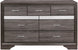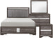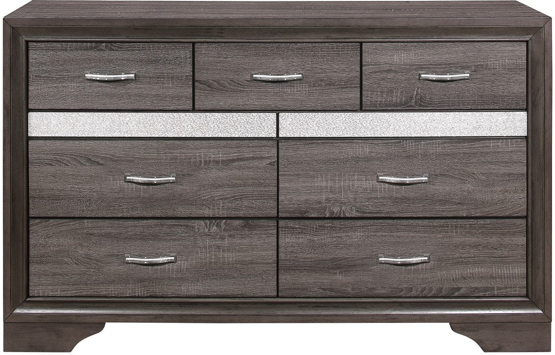 Product Description: The unique styling of the Luster Collection presents a glamorous option for your bedroom. The embossed faux-wood veneer features a gray finish that allows for the acrylic silver glitter fronts of the hidden jewelry drawers to shine. The jewelry drawers feature felt lining to protect your hidden items from wear and tear. The panel headboard features acrylic silver glitter accent banding as well as a gray faux leather channel-padded insert. Polished chrome bar drawer pulls front the drawers providing complementing contrast to the collection's finish.