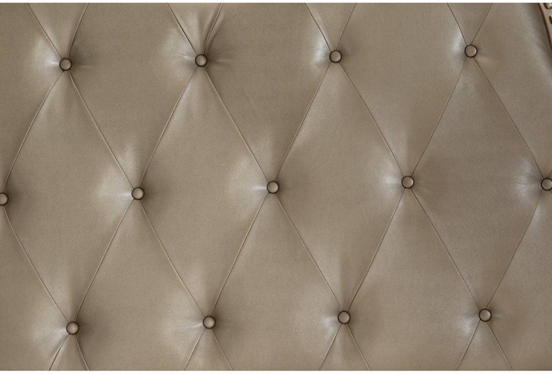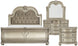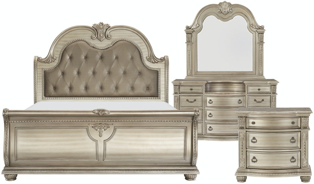 Product Description: The Cavalier Collection exemplifies the finest in Old World European design inspiration. Egg and dart base moldings, bead molding and acanthus leaf carvings all blend to achieve an elegant addition for your traditional bedroom. The grand Queen sleigh bed features a faux leather, button-tufted headboard insert. The bed's beautiful details are accented by the silver finish on birch veneer.
