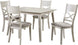 Specifications: Includes dining room table and 4 chairs. Made of acacia veneer, wood and engineered wood. Antique white finish. Fabric upholstery. Seats 4. Assembly required. Fabric Color: Gray. Fabric Content: 100 percent polyester. Fabric Cleaning Code: Upholstery (S). Prop 65 Information.