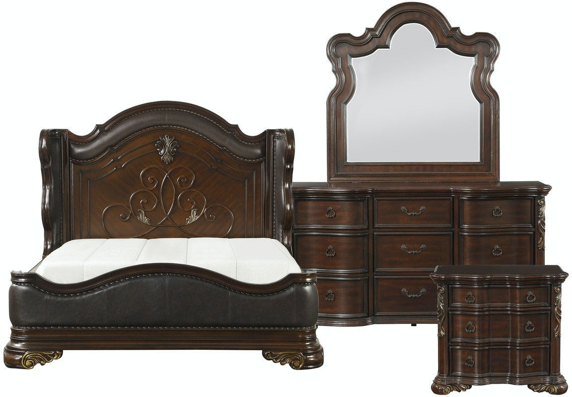 Specifications: Bedroom set includes queen bed, nightstand, dresser and mirror. Made of cherry veneer, wood and engineered wood. Cherry finish. Faux leather upholstered headboard, footboard and rails. Nightstand with 3 drawers with ball bearing glides. Dresser with 9 drawers with ball bearing glides. Dark bronze tone ring pulls. Fabric Color: Brown. Fabric Content: 100 percent Polyurethane. Fabric Cleaning Code: Upholstery (X). Prop 65 Information.