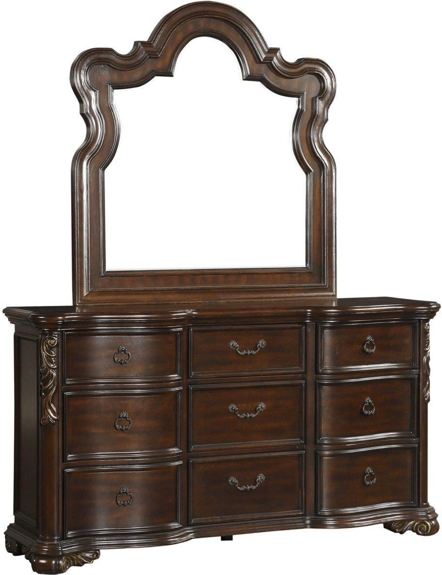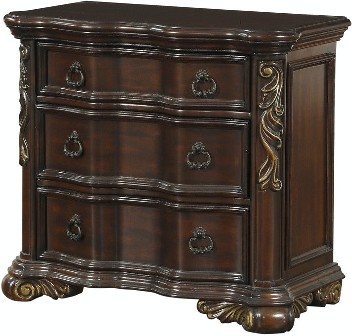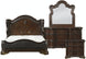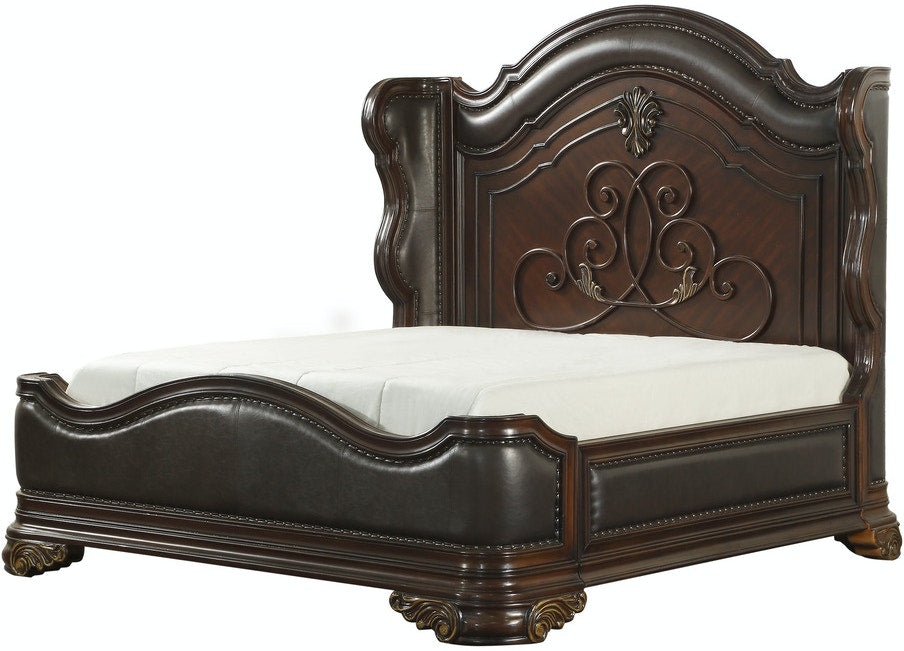 Product Description: Grandly styled for the traditional home is the Royal Highlands Collection. Prominent decorative scrolling adorns the headboard while heavier, carved scrolling accents the pilasters and feet of each piece in the collection. The substantial wood framing of the bed creates a distinct serpentine profile that carries into the design of the case pieces. Brown faux leather provides complementing contrast to the rich cherry finish. Traditional cherry and birch veneers accenting furthers the elegant presentation of the Royal Highlands Collection.