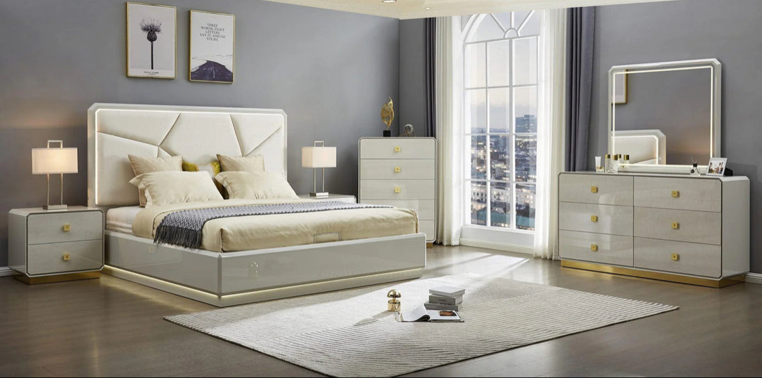 Transform your bedroom into a luxurious retreat with this Modern White and Gold Bedroom Set, designed to combine elegance, functionality, and modern style. Featuring sleek white and gold finishes, upholstered tufted designs, and built-in LED lighting, this set offers a sophisticated ambiance and practical storage solutions for your living space available exclusively at The Furniture Depot.