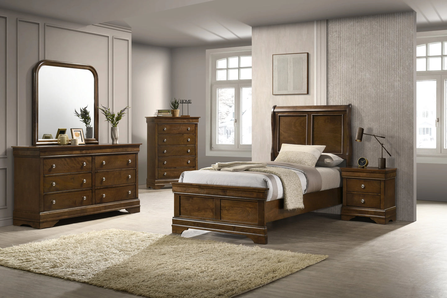 The bed features a panel headboard and footboard, adding to its traditional charm. The headboard and footboard are made from wood veneers and solids, as well as engineered wood (MDF), ensuring a durable and long-lasting finish. The overall design is simple yet elegant, making it perfect for those who appreciate a classic, understated look.