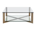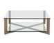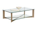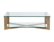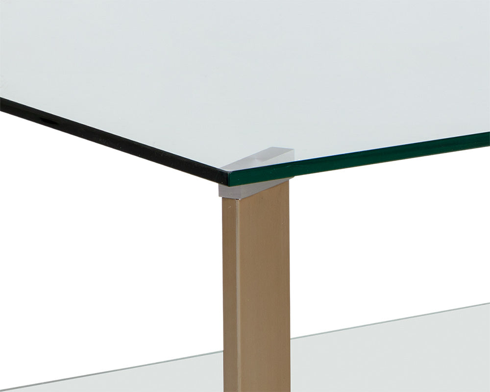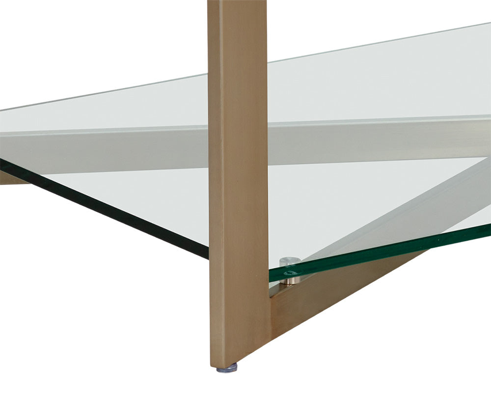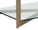A sleek and modern rectangular coffee table. Made with a tempered glass top and bottom shelf perfect for displaying decor and accents. Finished with an antique brass stainless steel frame. Also available in a rsquare shape, along with coordinating end table.
