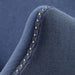 Contemporary Style Can Be Found In This Solidly Constructed Wing Chair. Featuring A Denim Blue Linen Blend Fabric Accented With Antique Bronze Nail Head Trim, On Slightly Tapered Oak Legs In A Weathered Sandstone Finish With A Light Tan Glaze. Seat Height Is 19".Product Features