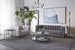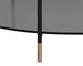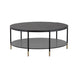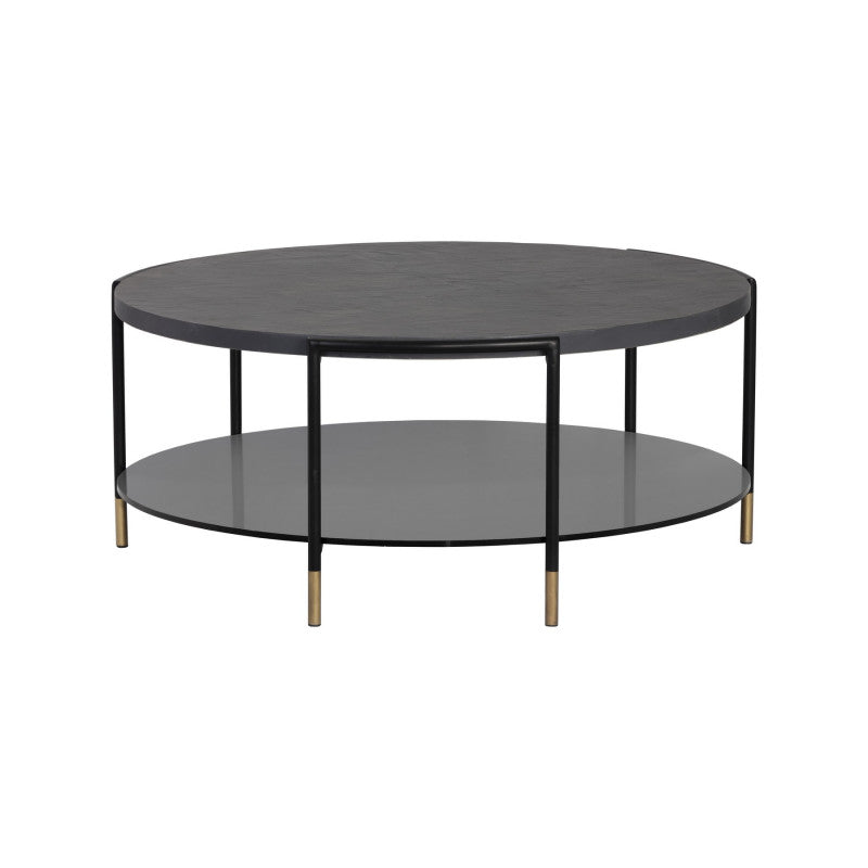 An alluring coffee table. Features a concrete top with a black/charcoal soft slate effect and a black tempered glass shelf. Finished with sleek black steel legs with brushed gold foot caps.