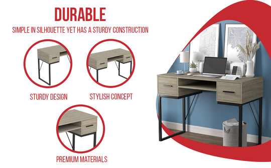 42.5" Computer Desk Dark Taupe 2 Drawers 1 Shelf Black Metal Base