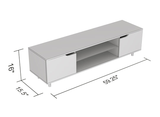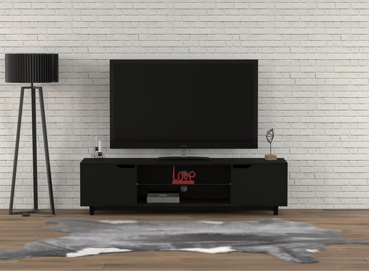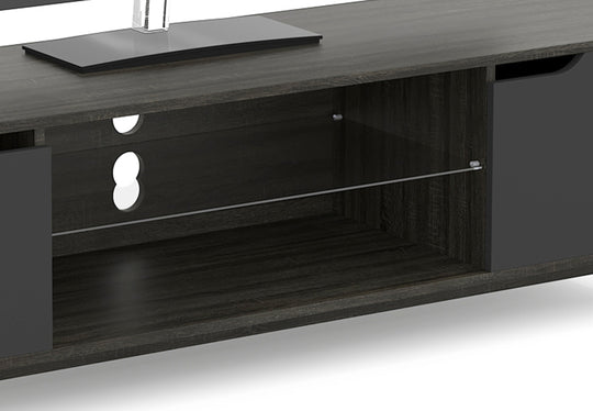 59" TV Stand Dark Grey Wood 2 Shelves 2 Black Doors