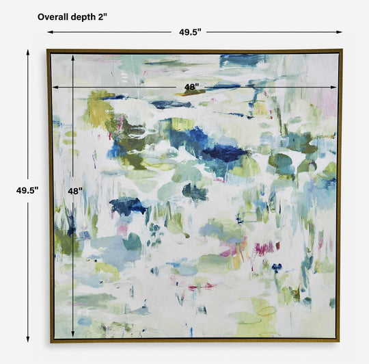 SALE             Abstract Reflections Framed Canvas The Abstract Reflections framed canvas features abstract shades of green and blue with highlights of fuchsia. A solid wood gallery frame with gold finish completes the artwork. May be hung horizontal or vertical. Each canvas is...Sale price $849.00Regular price $1,199.00Sale price $849.00Regular price $1,199.00