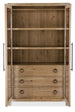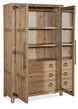 Inspired by California wine country and influenced by the craftsman architecture of the region, the stunning Vineyard Row Wardrobe is a striking and functional focal-point piece. Crafted of Pecky Hickory and White Oak Veneers with window-pane-designed door fronts, it is finished in the light and airy Sonoma, reminiscent of the crisp white wines of the Sonoma region. The two doors have mirror glass on the backs. One removable clothing rod, two adjustable wood shelves, three self-closing drawers and a top drawer with a removable black felt-lined jewelry tray and one partition are behind the doors. The center drawer has removable black felt liner. Rustic hammered metal accents and bar and ring pulls add to the craftsman appeal.