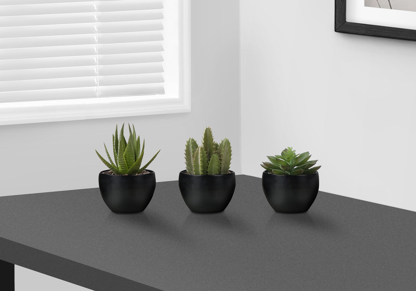 Add a touch of nature to your home or office with this set of 3 artificial succulent plants standing up to 6" tall. This sweet trio of faux green plants offer a no maintenance way to add some vibrancy to a room without the work. Our high-quality and durable decorative plants feature natural looking greenery that is hard to distinguish from the real thing. For indoor use only, each artificial plant is potted up in melamine black pots, with natural sand dressing on top, perfect for placing on tables, shelves, or other flat surfaces. Backed by a 5 year limited warranty against any defects, you will have the perfect accent for the home or office with this environmentally friendly set that requires no watering - simply unbox and enjoy these artificial tabletop plants!