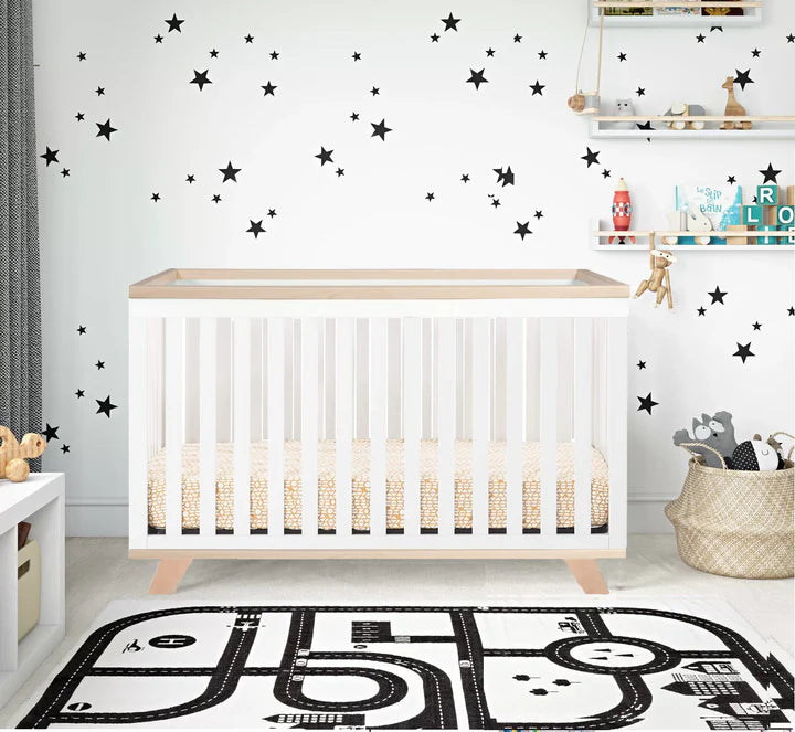 The Cleo 3-in-1 Baby Crib brings timeless midcentury modern design into your nursery. It showcases trendy tapered feet, a white and natural colour combination and a symmetrical silhouette that looks smart in the center of a room or against a wall. Designed to grow with your child, the convertible crib features a mattress platform that adjusts to four different heights and converts to a daybed and toddler bed (toddler rail sold separately).