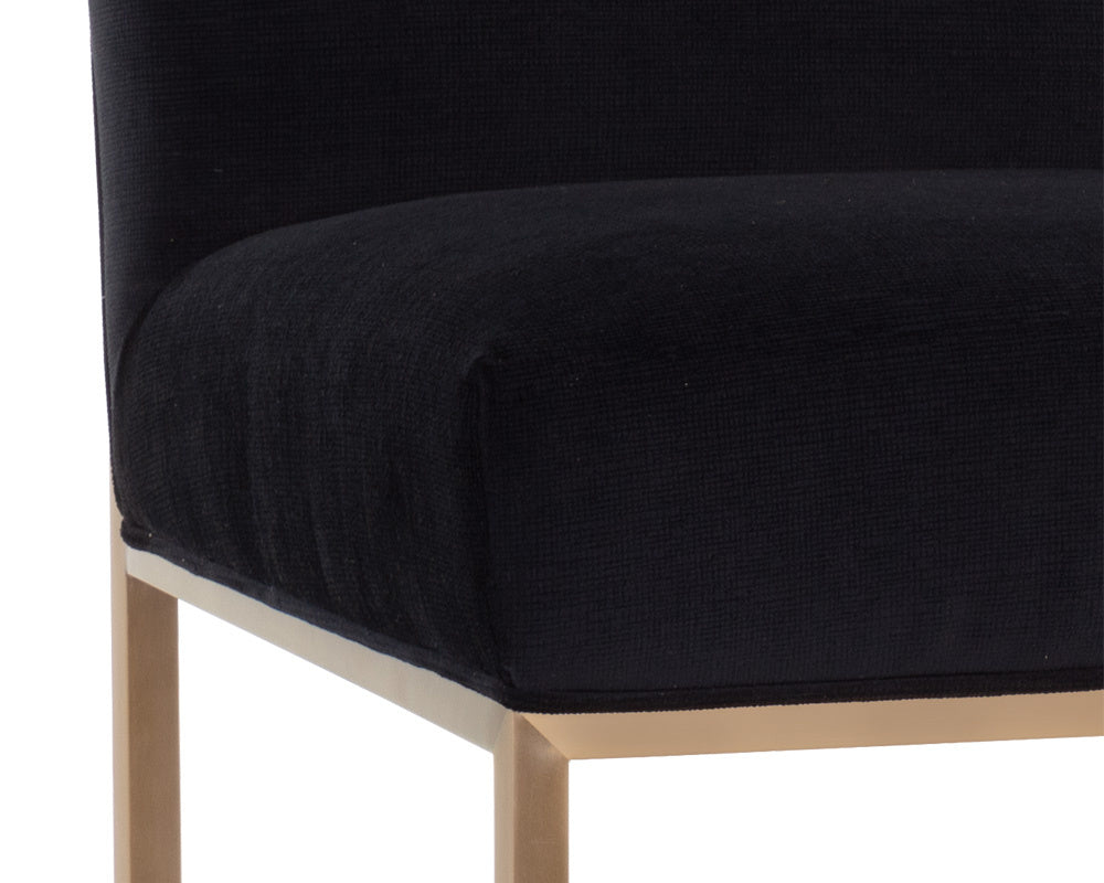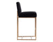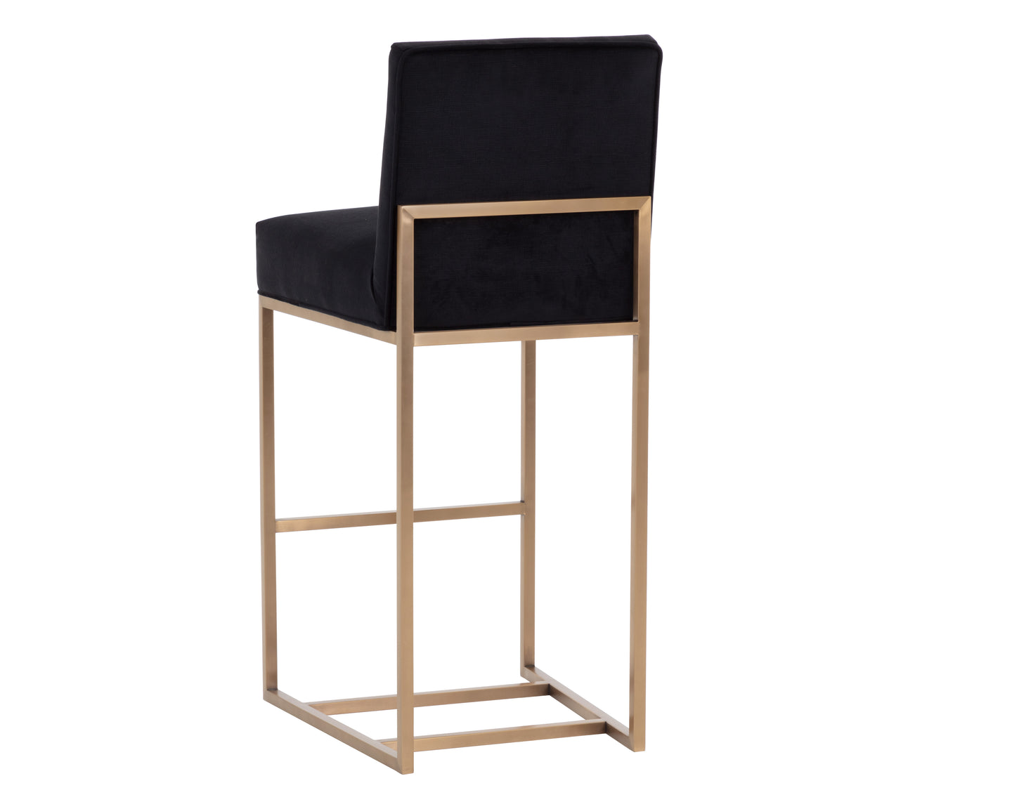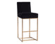 Clean lines define this modern, structured barstool that is ideal for any bar area. Stocked in cube black fabric and completed with an exposed stainless steel frame and legs in a gold finish.