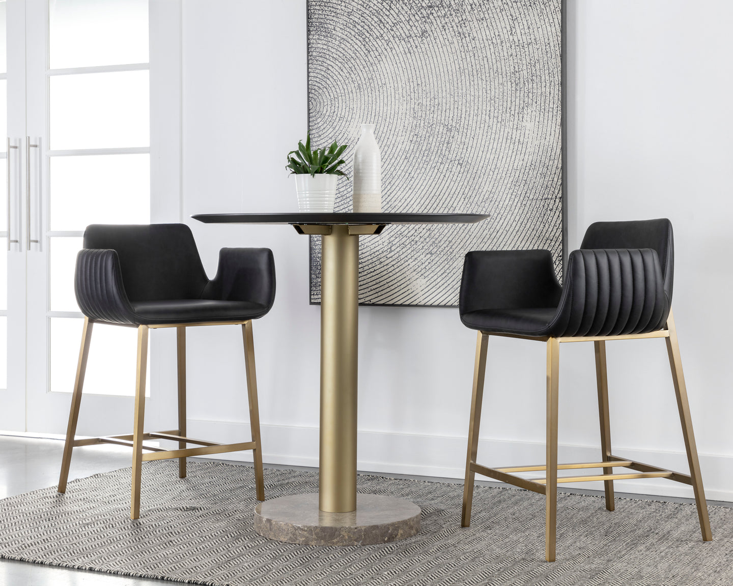 With its stunning scooped design, the Lucano Counter Stool is an impressive addition to any dining space. Features vertical channel tufting on exterior seat. Stocked in smooth bravo black faux leather and completed with gold stainless steel legs. Handle With Care: This design has been crafted with faux leather. Faux leather is manufactured to reflect the natural characteristics of leather; as such, colour variations, markings, wrinkles, grooves, and light scratches are appreciated characteristics. No two pieces will be alike. Visit our Product Care page for more information on how to ensure the lasting beauty of this piece.