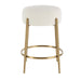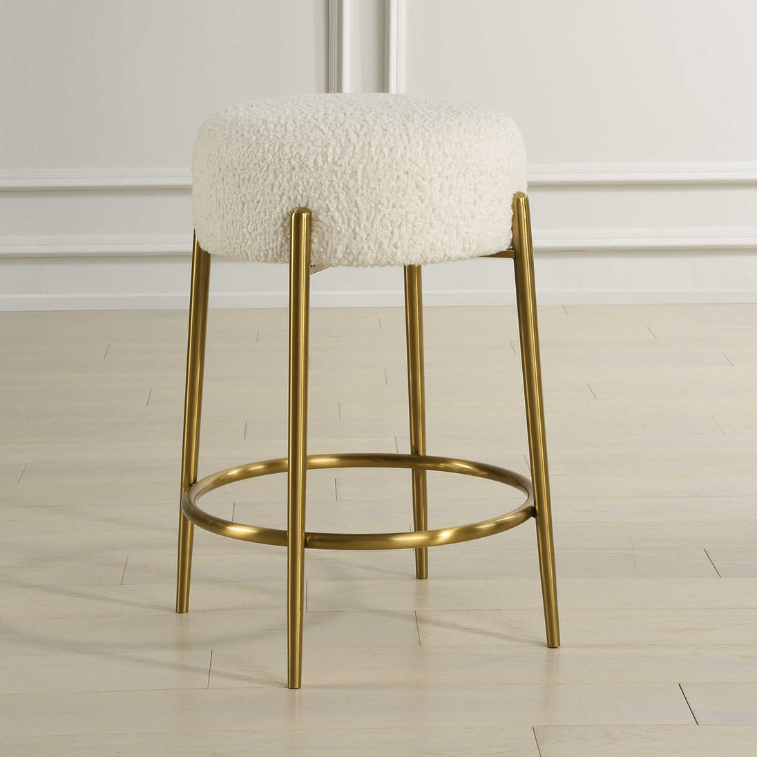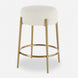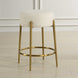 This plush counter stool is covered in a luxurious white faux shearling, suspended within brushed brass plated stainless steel legs.