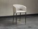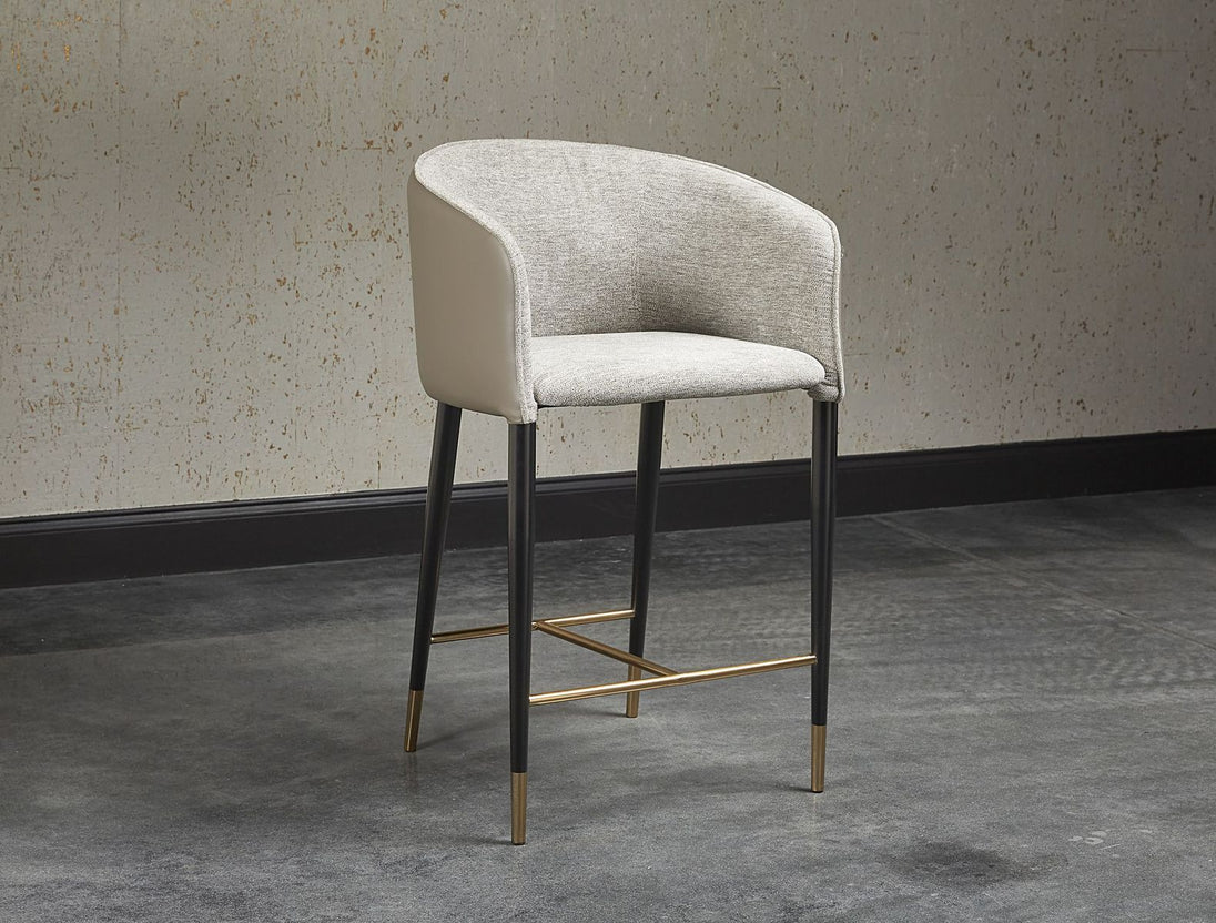 A modern barrel back counter stool upholstered in our flint grey fabric and contrasting napa taupe faux leather. Finished with black steel legs and brushed gold foot caps. Also available in sparrow fabric and napa black faux leather. Suitable for various dining, kitchen and bar spaces of all sizes. Handle With Care: This design has been crafted with faux leather. Faux leather is manufactured to reflect the natural characteristics of leather; as such, colour variations, markings wrinkles, grooves, and light scratches are appreciated characteristics. No two pieces will be alike. Visit our Product Care page for more information on how to ensure the lasting beauty of this piece.