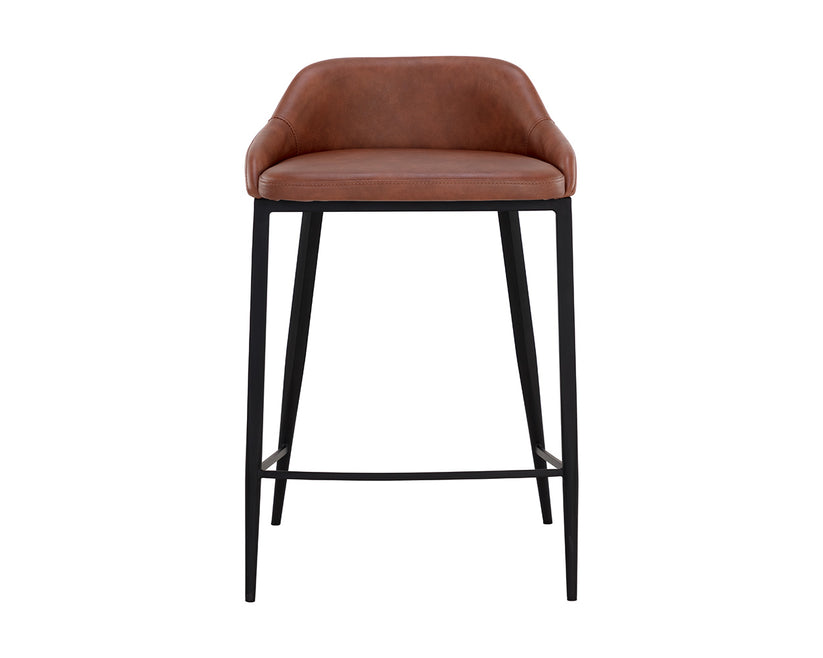 The Astra Counter Stool is distinguished by its strong modern silhouette and sleek black powder-coated iron legs. Smooth cinnamon brown faux leather wraps around a comfortable low back seat. Handle With Care: This design has been crafted with faux leather. Faux leather is manufactured to reflect the natural characteristics of leather; as such, colour variations, markings, wrinkles, grooves, and light scratches are appreciated characteristics. No two pieces will be alike. Visit our Product Care page for more information on how to ensure the lasting beauty of this piece.