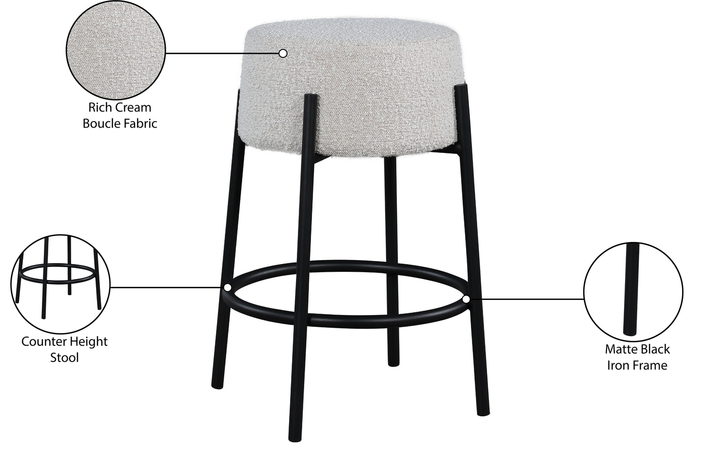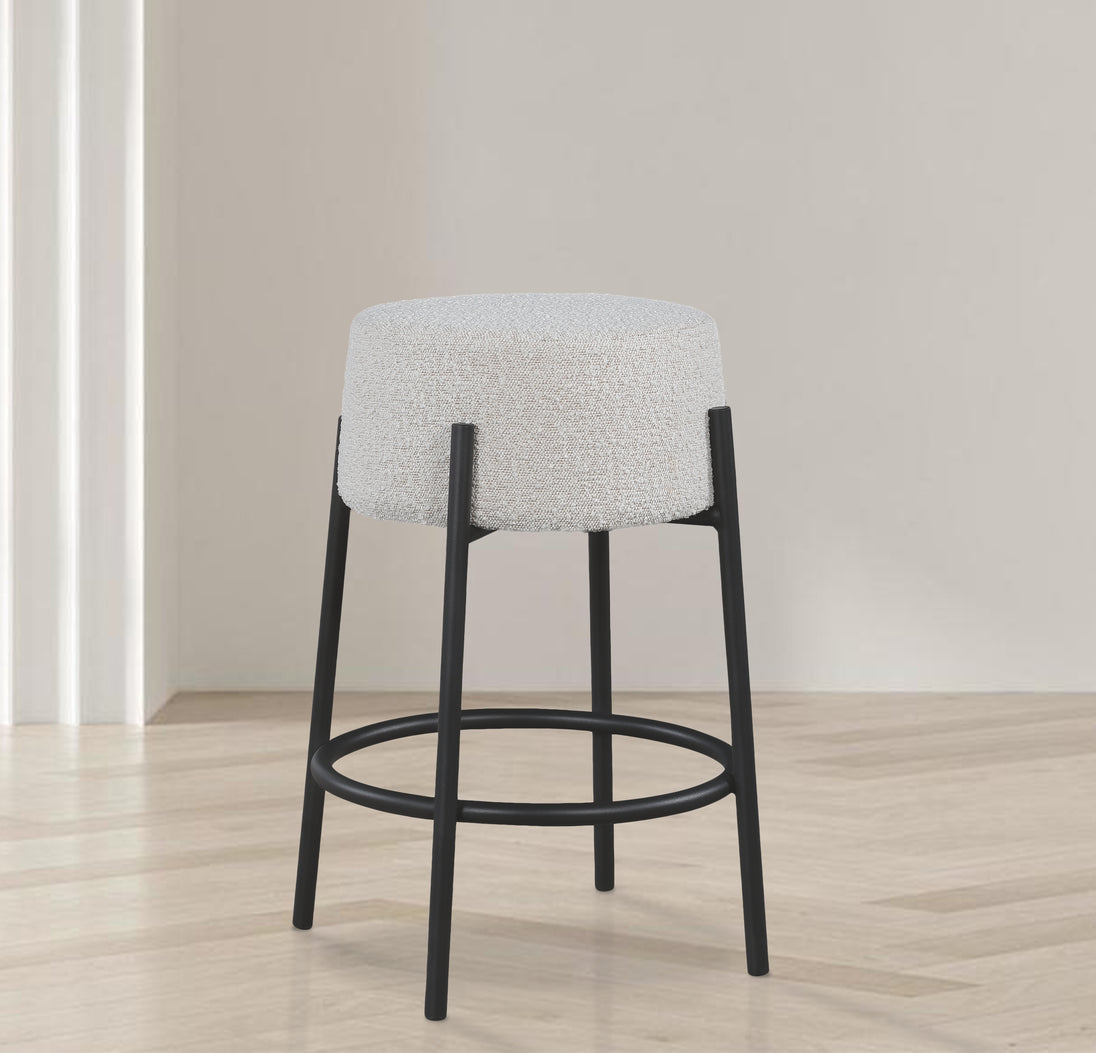 Give your kitchen or dining area a contemporary makeover with this Avalon cream boucle fabric counter stool. With its matte black iron frame and rich cream boucle fabric, this stool is both sturdy and stylish. This stool is counter height, making it the perfect addition to your breakfast bar or high dining table. A round foot iron foot rest curves around its legs, ensuring your feet don't dangle or grow tired while you sit, and its contemporary design is just right for the modern home.