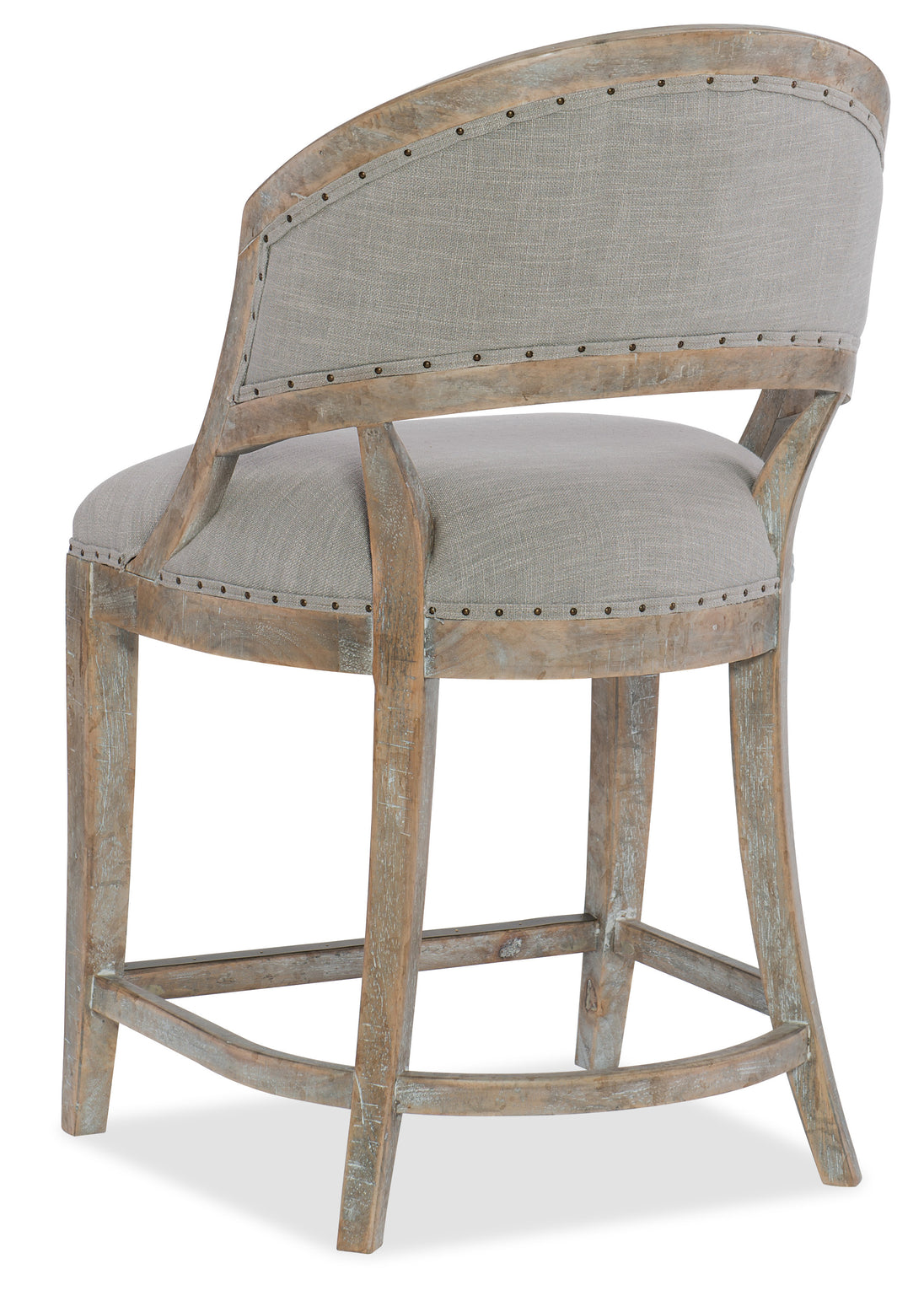 Linger over conversations and relaxing meals -- in comfort and style with the Boheme barrel-back, 39-inch-high counter stools. Design details are delightful, with a nail-lined gimp welt lining the outside of the seat and back, with each stool covered in a soft gray Antwerp Linen fabric. The textural Antique Milk White finish is a nearly opaque brush-painted look over a soft brown surface.