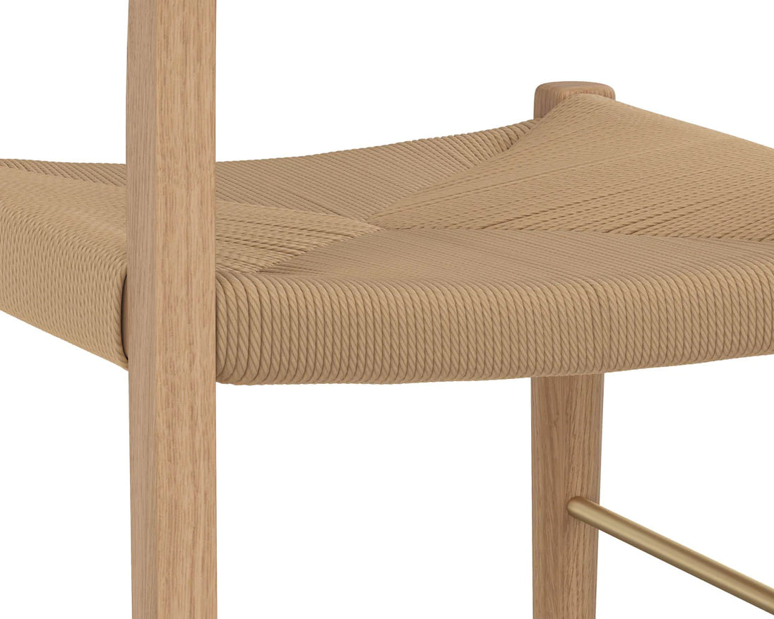 This modern take on a classic counter stool design offers timeless style for any space. Features a white wash oak frame with a natural rope seat. Due to the natural contents of natural paper rope, it is advised to minimize contact with strongly dyed fabrics to avoid discolouration and/or colour transfer. As wood is an organic, porous material, these pieces will contain natural variation of texture and may also exhibit fine indentations and cracks. Wood pieces will also display a disparity of colour and grain, and visible knots and burls that add to the character of each piece.