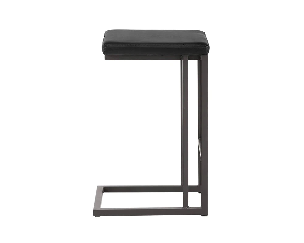 A modern industrial stool featuring a backless seat in onyx faux leather and a cantilever frame with footrest in grey powder coated steel. Suitable for various dining, kitchen and bar spaces of all sizes. Handle With Care: This design has been crafted with faux leather. Faux leather is manufactured to reflect the natural characteristics of leather; as such, colour variations, markings wrinkles, grooves, and light scratches are appreciated characteristics. No two pieces will be alike. Visit our Product Care page for more information on how to ensure the lasting beauty of this piece.