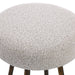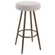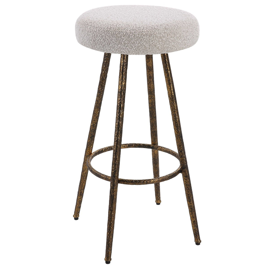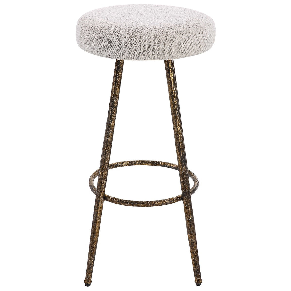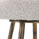 Sturdy and stylish, the Braven counter stool features tapered legs with a hammered texture, finished in heavily antiqued metallic gold topped with a cushioned seat with a casual white and warm gray boucle fabric.
