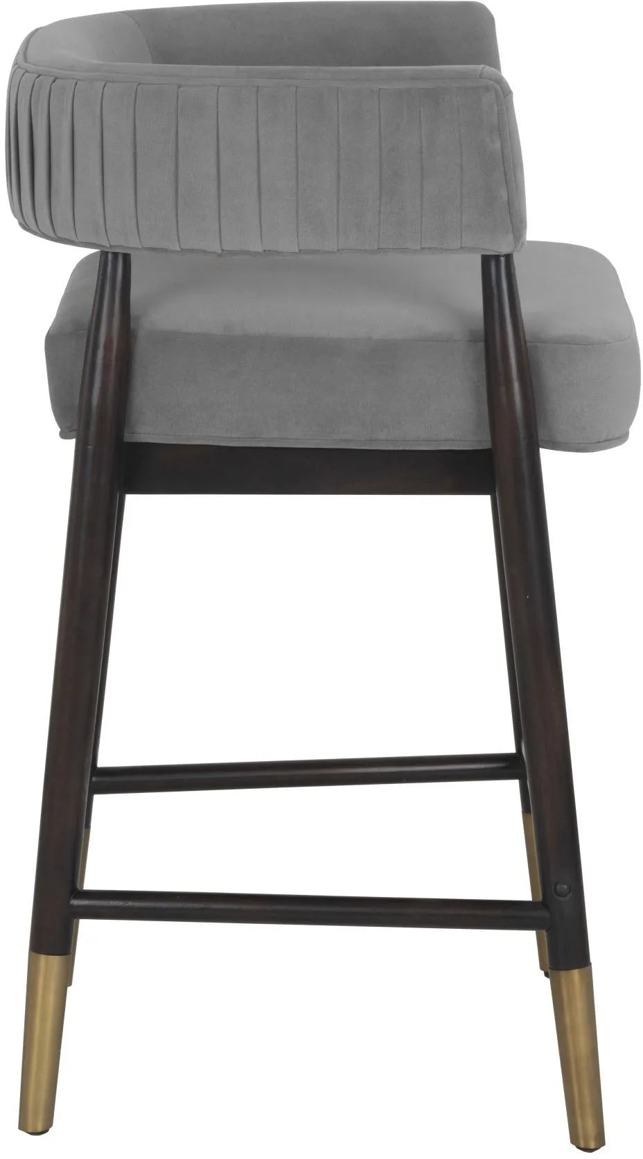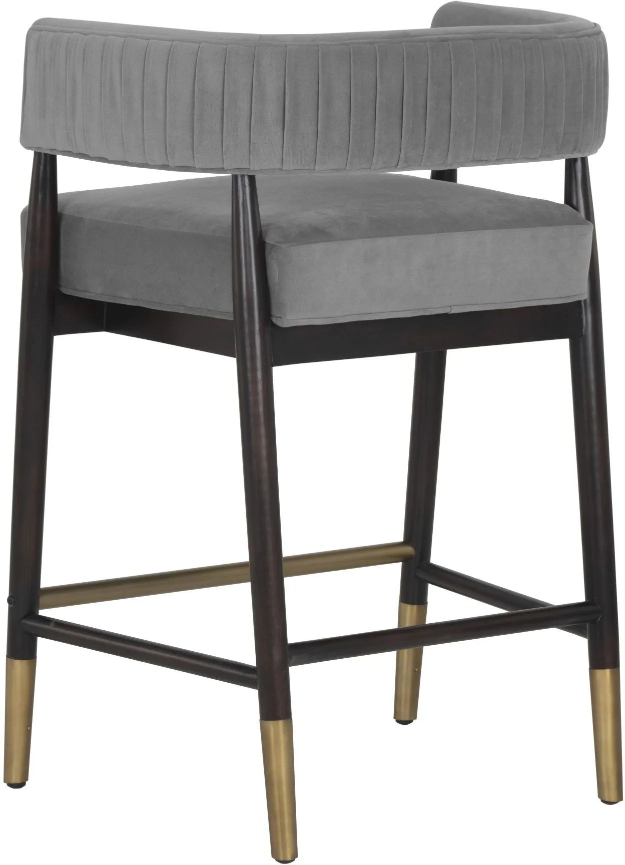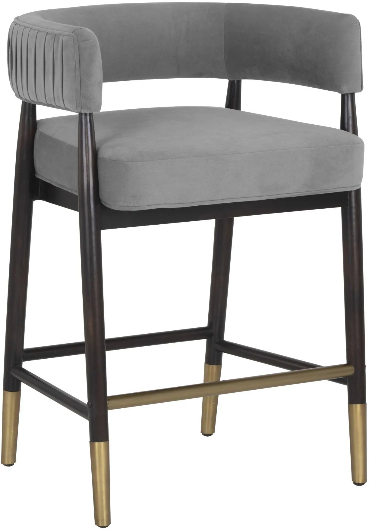 Invite guests to relax in this elegant open back counter stool. Features a modern barrel back seat in antonio charcoal fabric with ruching on the exterior. An exposed brown birchwood frame with gold metal caps completes the look. Perfect for living, lounge and office spaces.