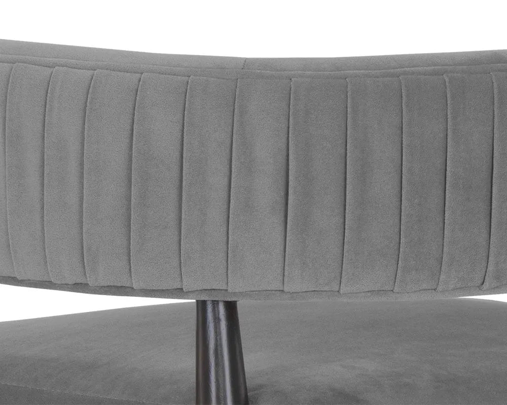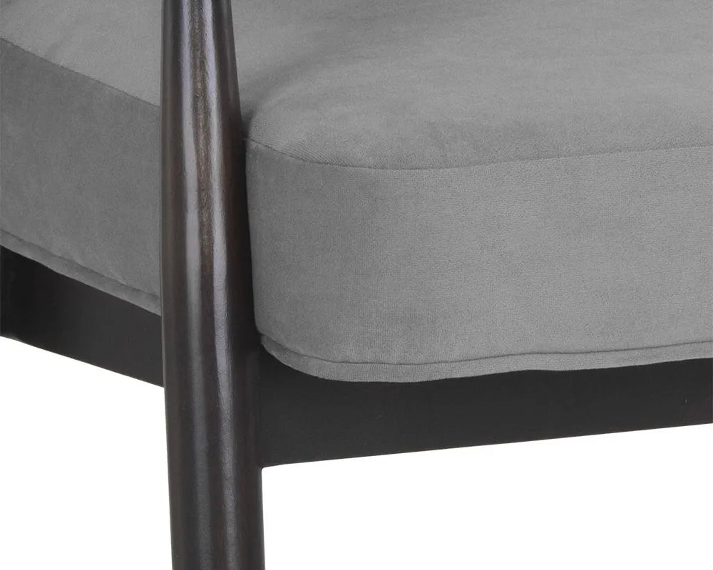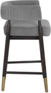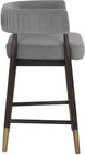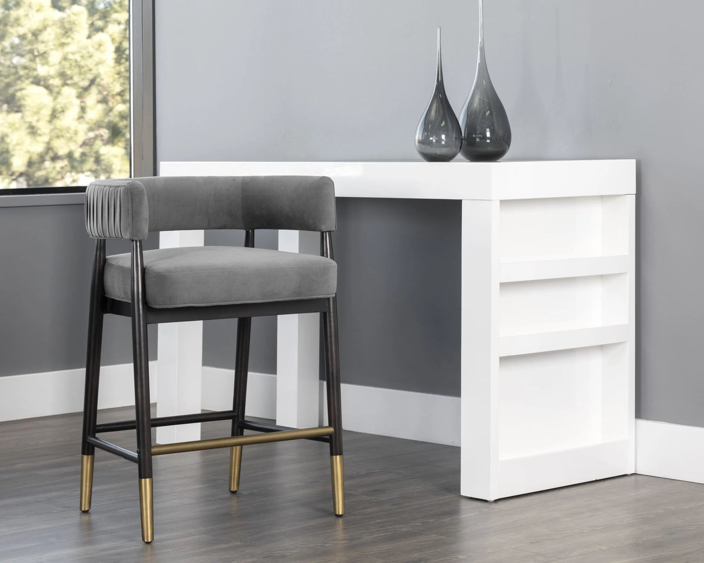 Invite guests to relax in this elegant open back counter stool. Features a modern barrel back seat in antonio charcoal fabric with ruching on the exterior. An exposed brown birchwood frame with gold metal caps completes the look. Perfect for living, lounge and office spaces.