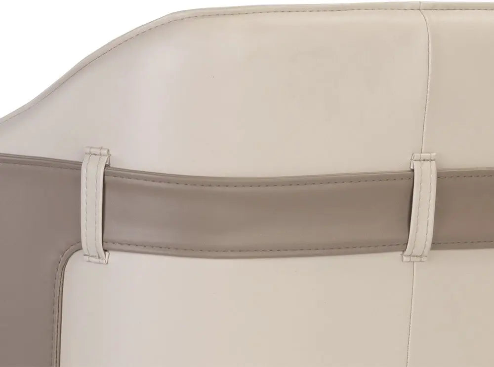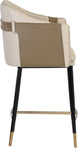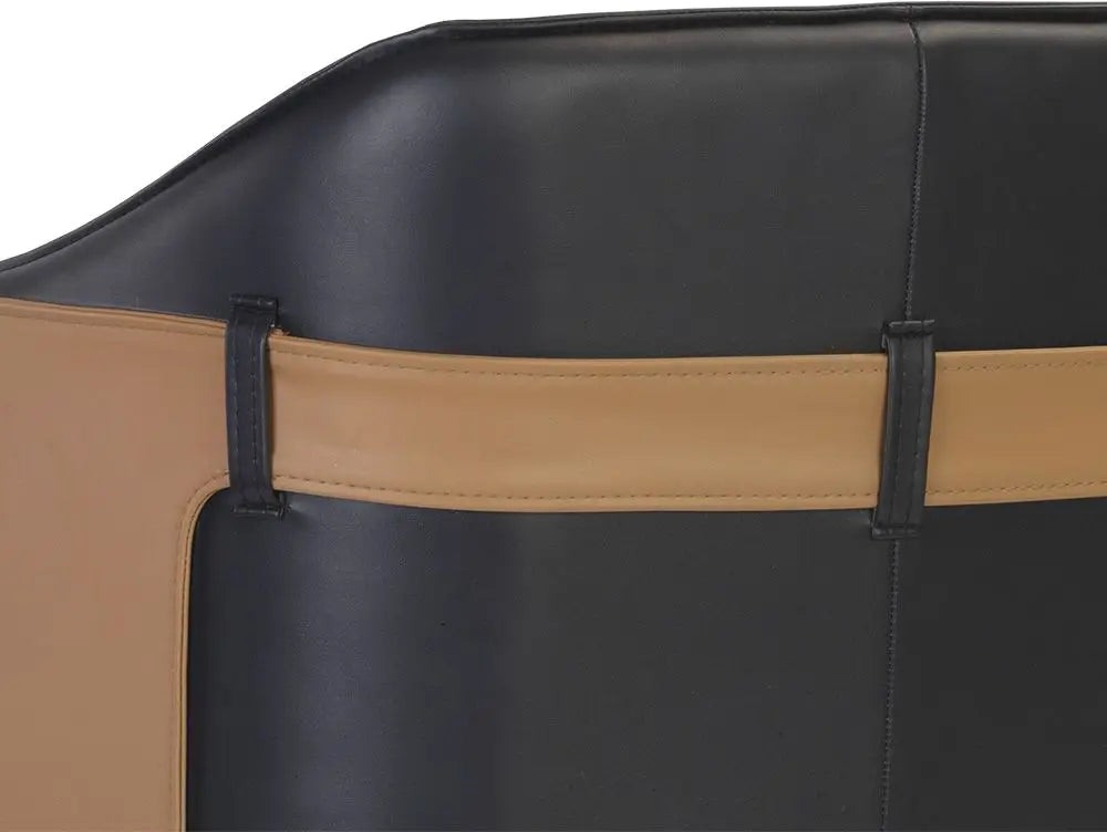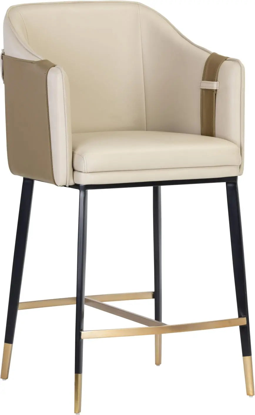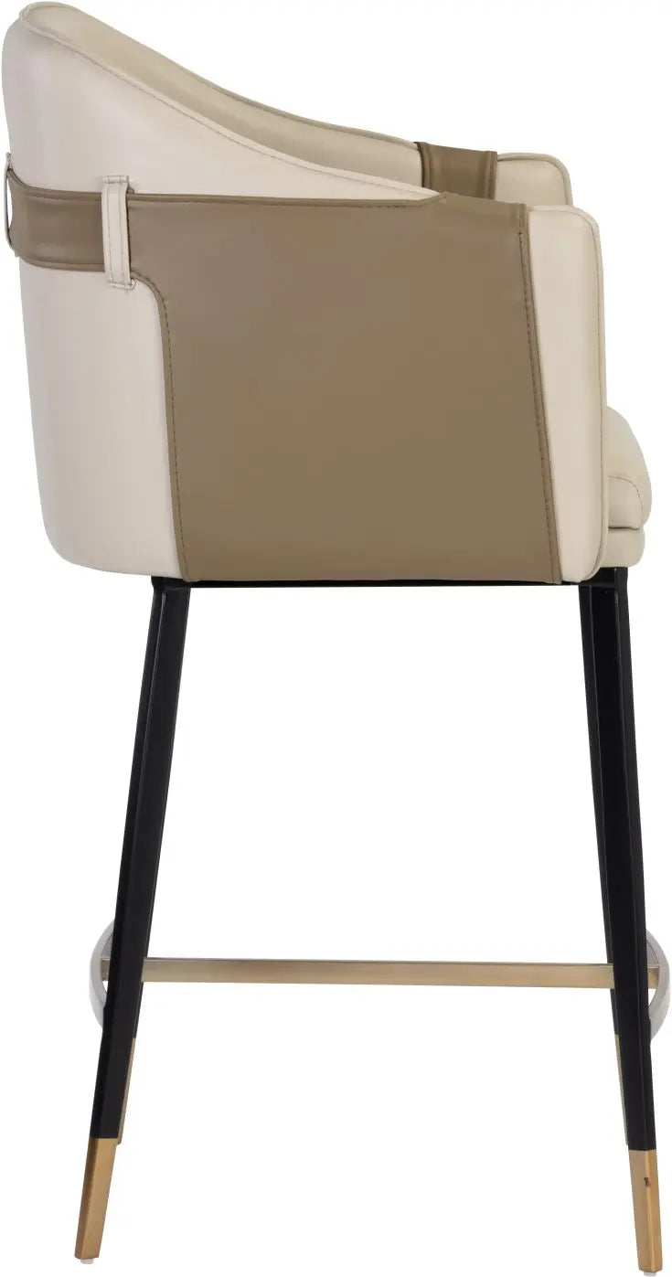 A unique barrel back counter stool upholstered in supple napa beige faux leather and accented with a contrasting exterior in napa tan faux leather. Finished with black steel legs and copper foot caps. Suitable for residential and commercial spaces. Handle With Care: This design has been crafted with faux leather. Faux leather is manufactured to reflect the natural characteristics of leather; as such, colour variations, markings wrinkles, grooves, and light scratches are appreciated characteristics. No two pieces will be alike. Visit our Product Care page for more information on how to ensure the lasting beauty of this piece.