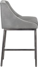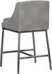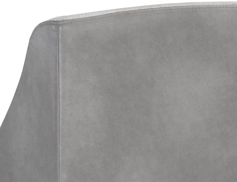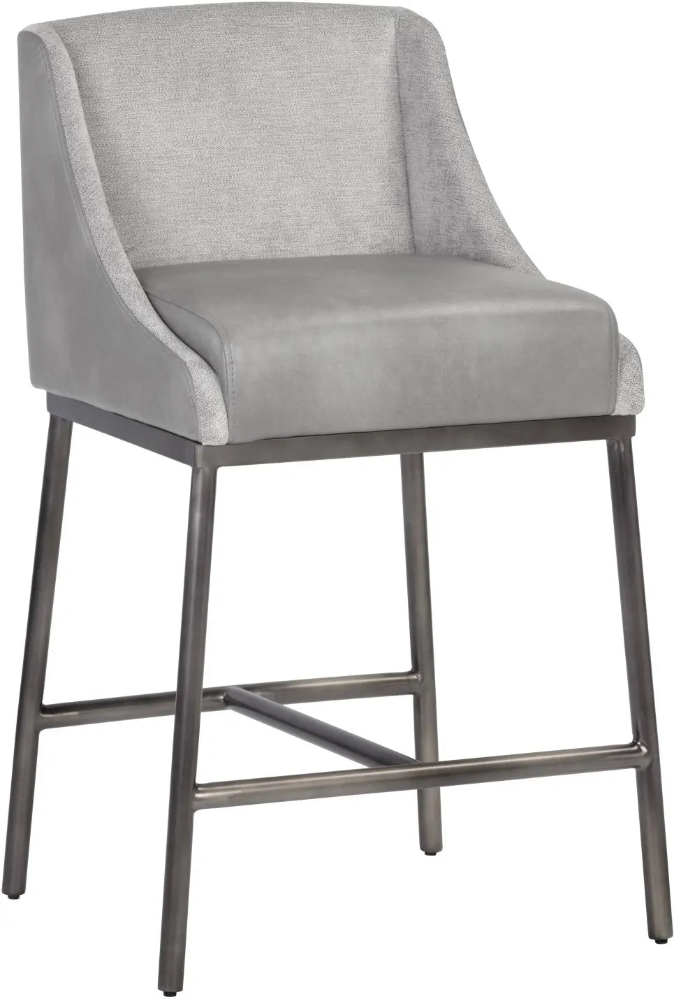 This counter stool from our Ikon collection features a classic silhouette with contemporary flair. Features contrasting seat, seatback and exterior upholstery in bravo metal faux leather and polo club stone performance fabric. Brushed metal finish legs complete the look. Performance fabric is moisture repellent, stain resistant and easy to clean. Suitable for various dining, kitchen and bar spaces of all sizes. Handle With Care: This design has been crafted with faux leather. Faux leather is manufactured to reflect the natural characteristics of leather; as such, colour variations, markings, wrinkles, grooves, and light scratches are appreciated characteristics. No two pieces will be alike. Visit our Product Care page for more information on how to ensure the lasting beauty of this piece.
