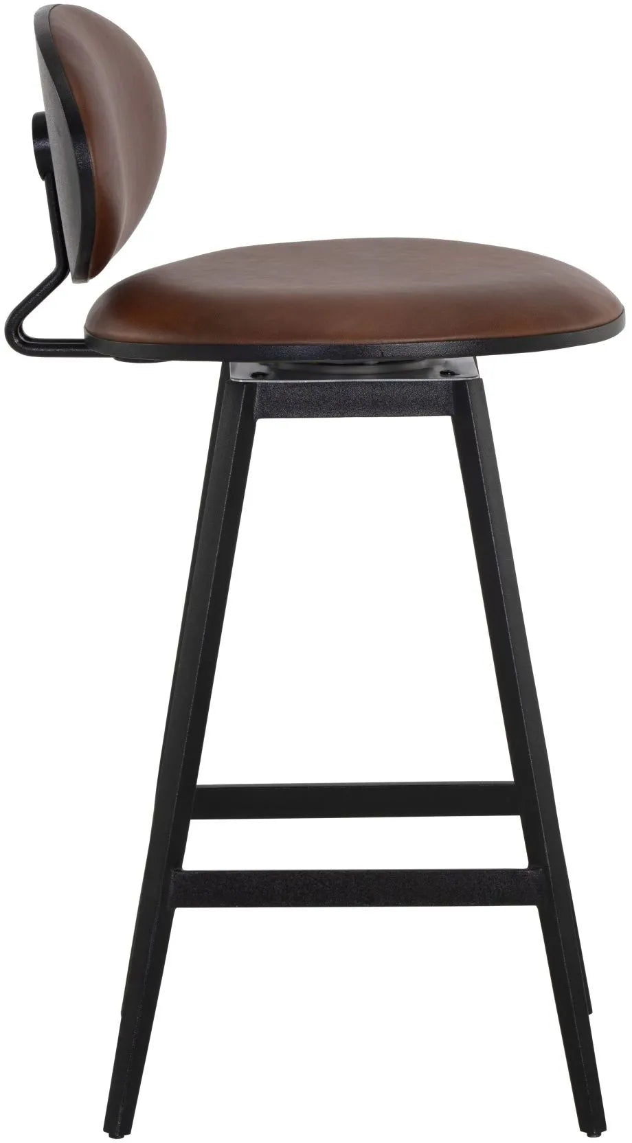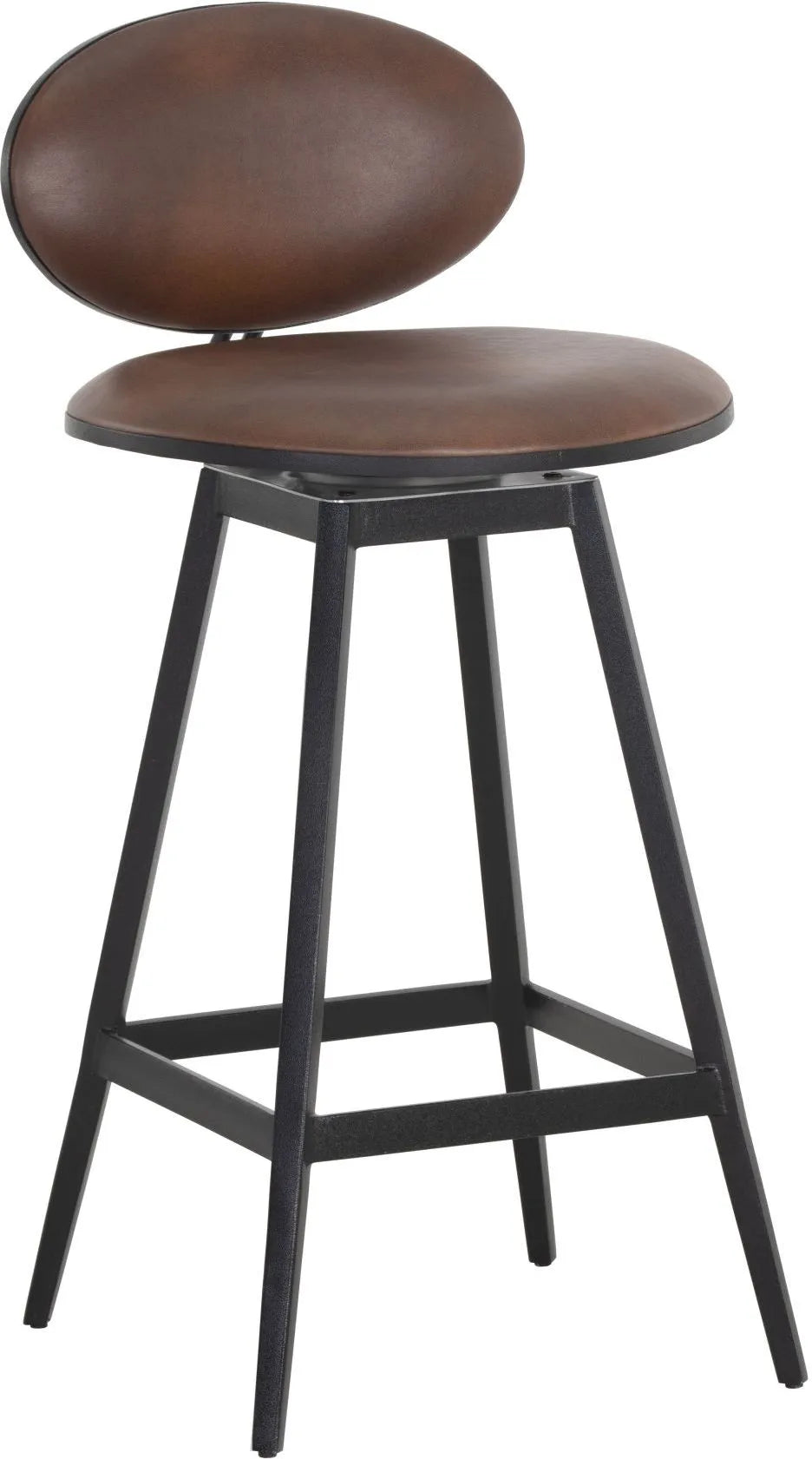 A unique mid-century modern swivel counter stool crafted in India. Features an oval seat and seatback in bravo cognac faux leather with a black steel frame. Features a 360 degree swivel. Suitable for various dining, kitchen and bar spaces of all sizes. Handle With Care: This design has been crafted with faux leather. Faux leather is manufactured to reflect the natural characteristics of leather; as such, colour variations, markings, wrinkles, grooves, and light scratches are appreciated characteristics. No two pieces will be alike. Visit our Product Care page for more information on how to ensure the lasting beauty of this piece.