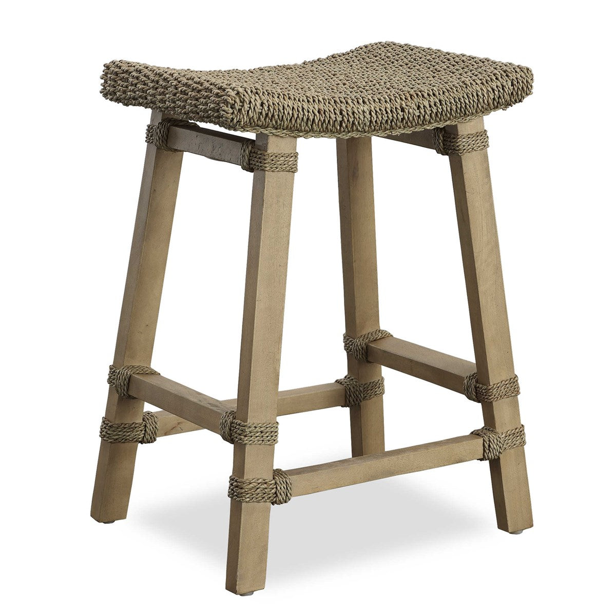 The Everglade Counter Stool offers a touch of casual coastal styling. The sturdy mango wood base is naturally finished to showcase the grain and texture of the wood, accentuated by a natural woven sea grass and rattan seat and wrapped accents.