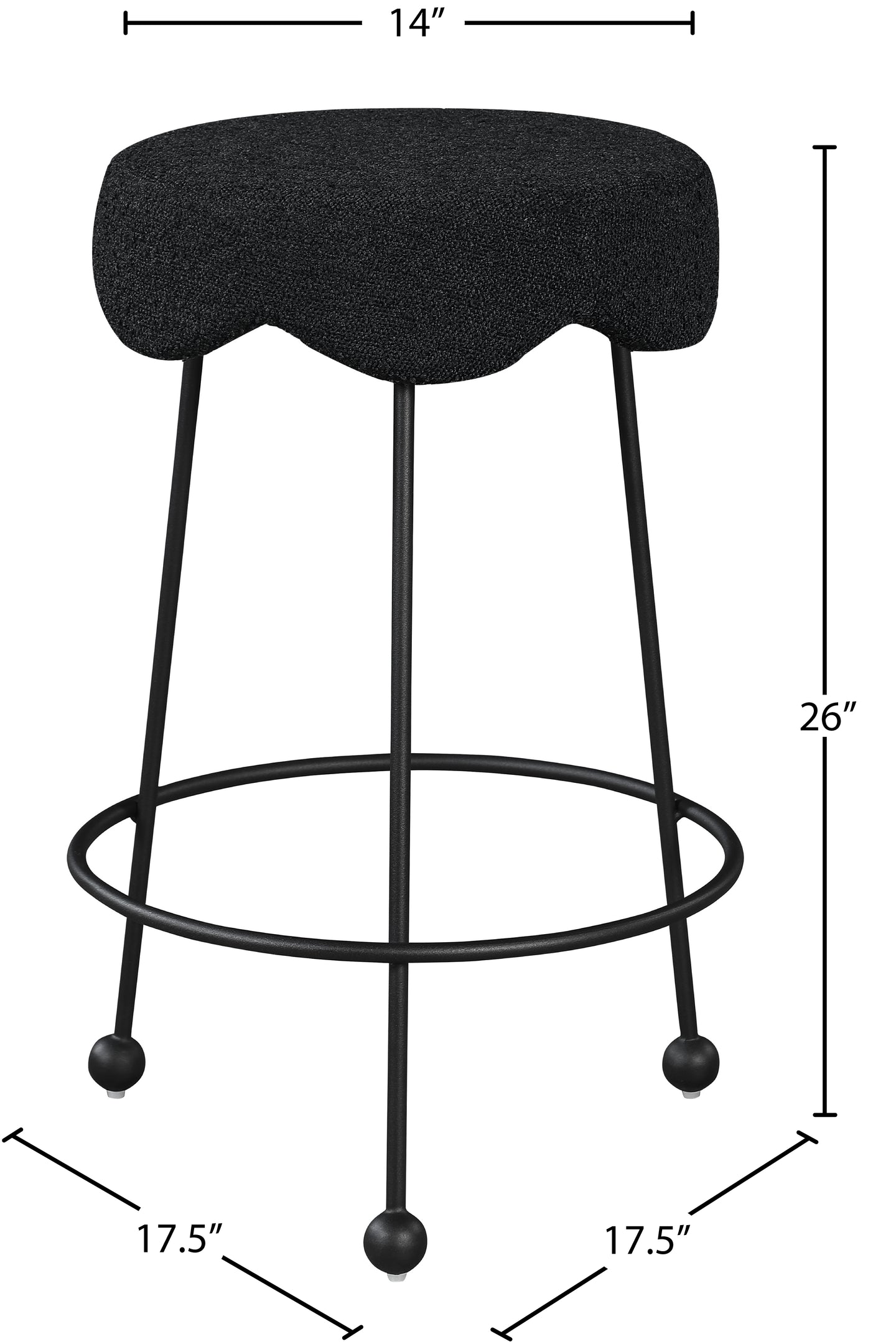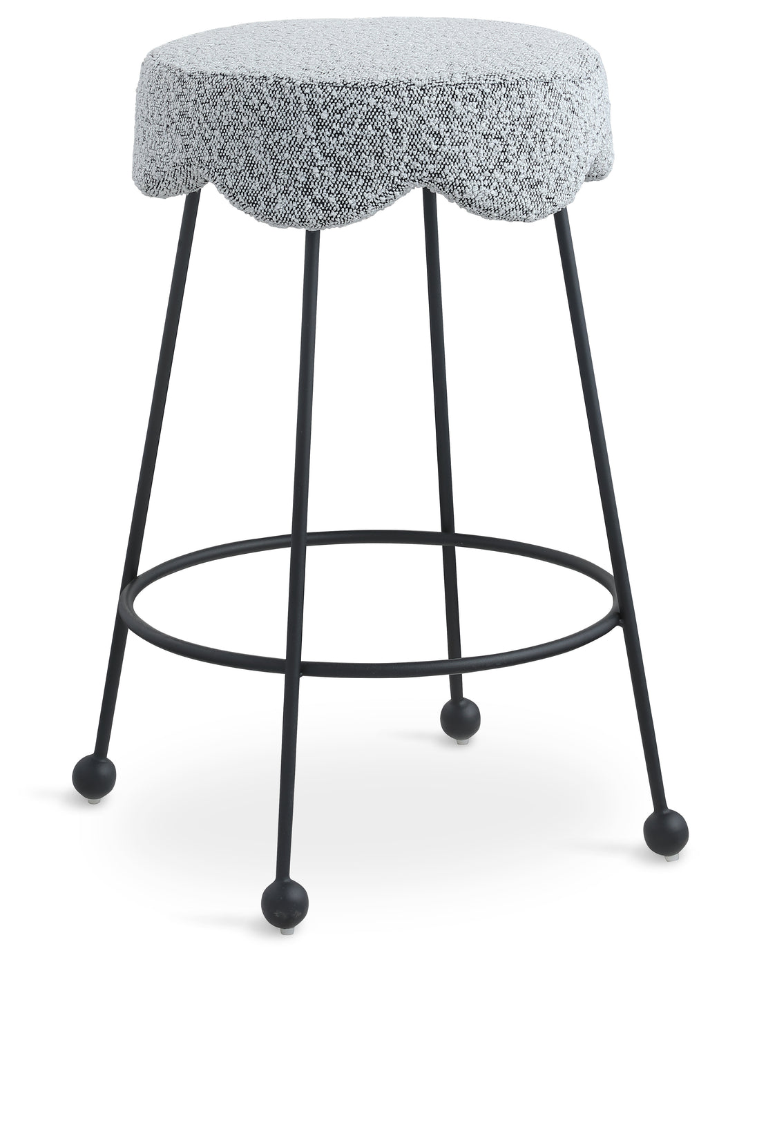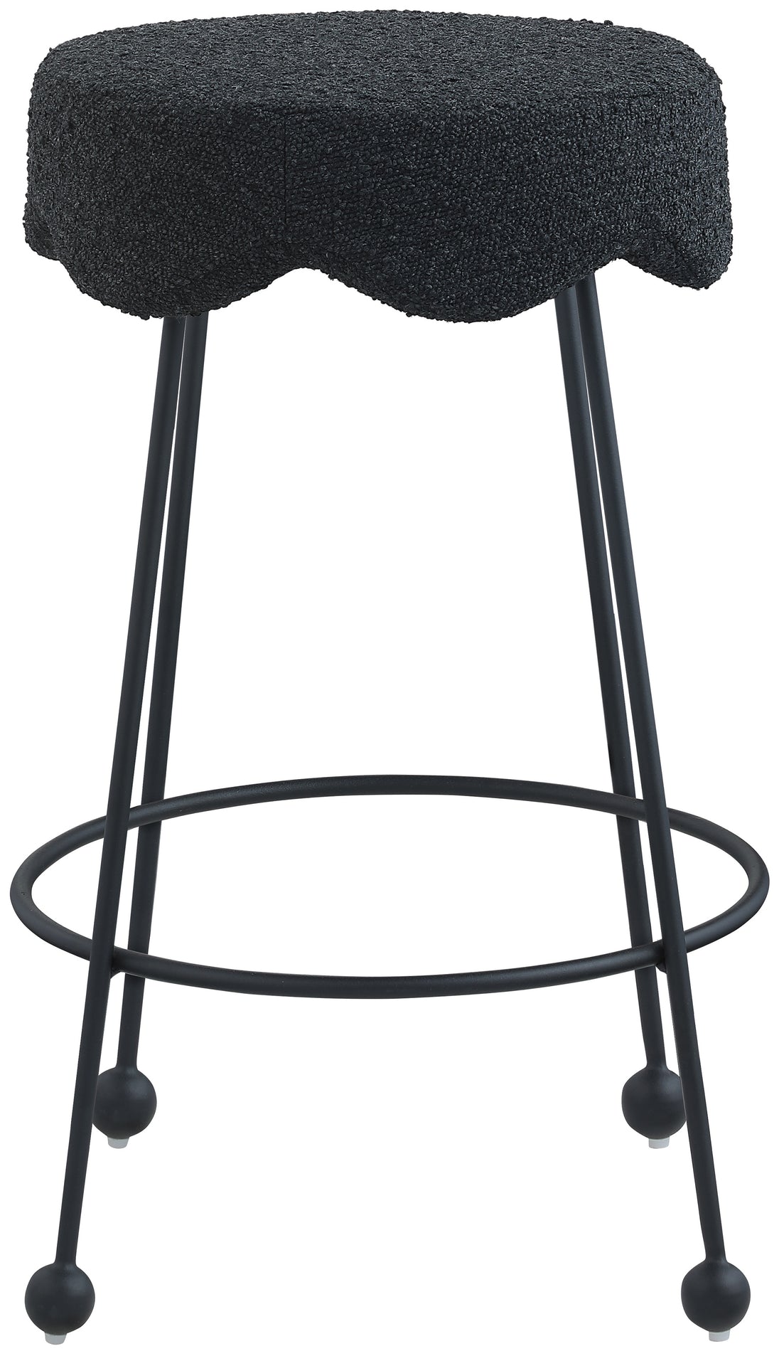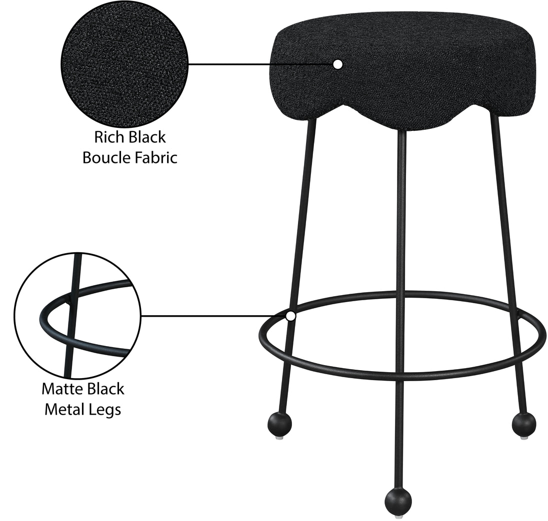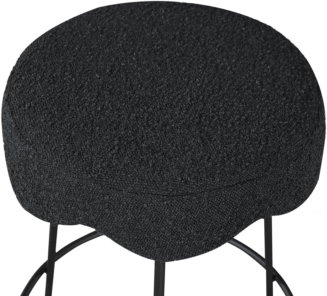 Give your dining area a unique touch with this Fleur black fabric counter stool. Its rich black boucle fabric seat is padded with foam, providing comfort while you're sitting, and its matte black metal legs ensures sturdiness and durability. A round footrest encircles its three metal legs, giving you a place to rest your feet while sitting at your breakfast counter or bar. A contemporary design ensures this counter stool matches your existing home decor.