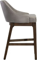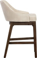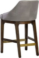 A mid-century style counter stool designed with organic elements. Crafted with solid rubberwood legs with a dark brown finish and brass finished stainless steel stretchers for added support. Available in leo olive and shale grey fabric or bravo cream and metal faux leather. Handle With Care: This design has been crafted with faux leather. Faux leather is manufactured to reflect the natural characteristics of leather; as such, colour variations, markings, wrinkles, grooves, and light scratches are appreciated characteristics. No two pieces will be alike. Visit our Product Care page for more information on how to ensure the lasting beauty of this piece.
