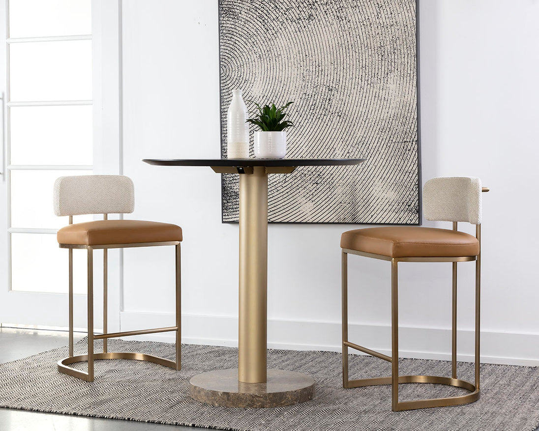 The Larissa Counter Stool brings together a beautiful display of mixed materials. A low seatback upholstered in rhea light barley fabric contrasts the warm tones of the seat upholstered in napa cognac faux leather for an elevated aesthetic. The antique brass stainless steel frame features a handle on the back for a functional and stylish addition. Handle With Care: This design has been crafted with faux leather. Faux leather is manufactured to reflect the natural characteristics of leather; as such, colour variations, markings, wrinkles, grooves, and light scratches are appreciated characteristics. No two pieces will be alike. Visit our Product Care page for more information on how to ensure the lasting beauty of this piece.