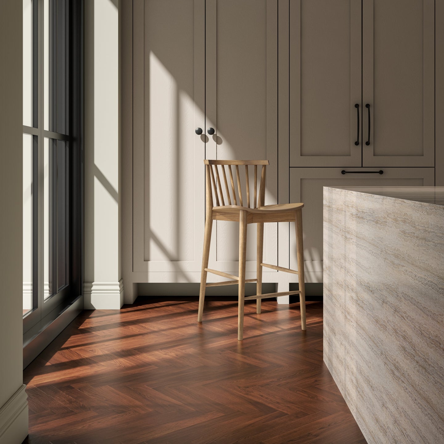 Crafted from solid oak, the Marly counter stool exudes warmth and character. This spindle-back chair's graceful silhouette offers visual intrigue and ergonomic support, while the smaller scale ensures versatility. Sold in sets of two.